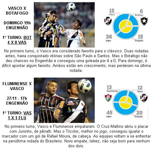 Dos quatro confrontos até o fim do Brasileirão, o Vasco estará presente em três. Pega Fluminense e Flamengo nas duas últimas duas rodadas e, o Botafogo, já no próximo domingo. O mesmo Alvinegro ainda vai enfrentar o Tricolor carioca na última rodada.