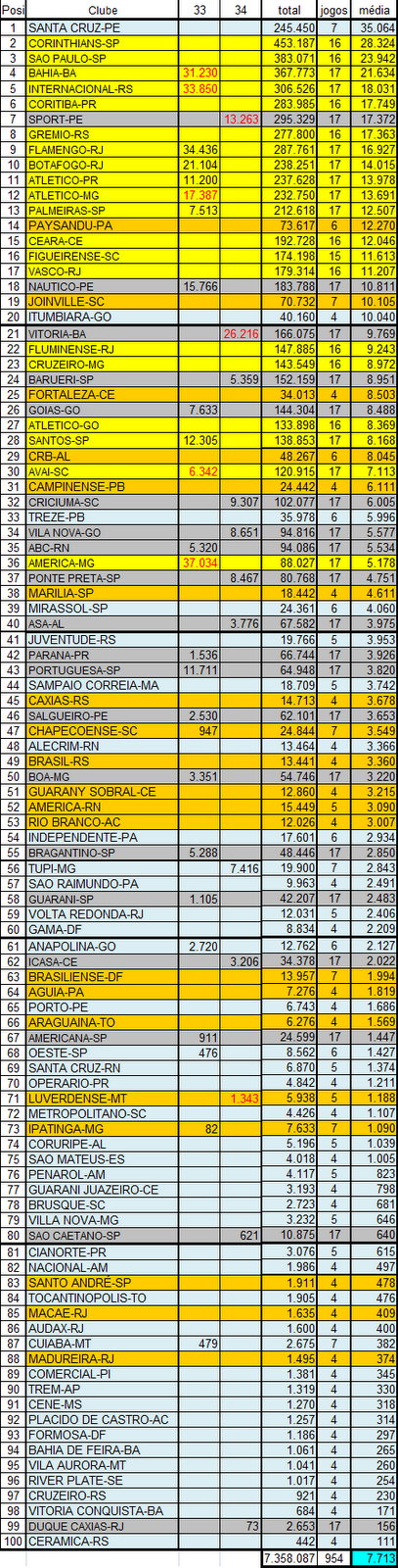 # O ranking é feito apenas com os torcedores pagantes e levando em conta os públicos dos mandantes das partidas.
