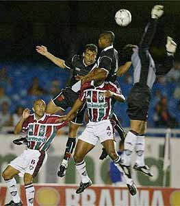 no meio da área para, de cabeça, colocar o Fluminense na frente.