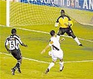 rasteiro, à direita do gol do Botafogo.