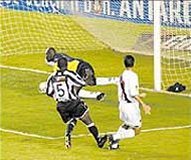 lançamento na direita, entrou na área e tocou na saída de Max, por