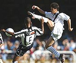 frontal na entrada da área, em disputa com o zagueiro Rafael Marques.