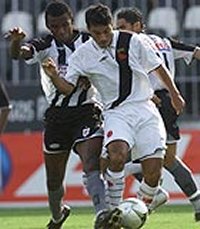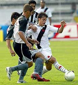 prensado, pelo lado, no primeiro lance de real perigo para o Vasco.