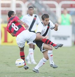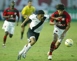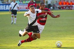 | NETVASCO - 17/07 - 18:00 - VASCO PERDE CLÁSSICO E ESTÁ EM PENÚLTIMO: URUBU 1 A 0 O Flamengo precisou de um chute certeiro de um estreante para amenizar sua situação no Campeonato Brasileiro. Neste domingo, logo em seu debute com a camisa rubro-negra, o meia Souza marcou o gol da vitória por 1 a 0 no "clássico dos desesperados" contra o Vasco, em Volta Redonda. Com a vitória, o Flamengo chegou aos 12 pontos e deixou a zona de rebaixamento. O time não triunfava havia sete jogos - mais de dois meses - e vinha de uma seqüência de três derrotas. Já o Vasco continua atolado na área de descenso, com nove pontos. Sem vencer há seis jogos, a equipe coleciona seu terceiro revés consecutivo. "Gol importante para a equipe e fico feliz com isso. Senti a falta de ritmo de jogo. Às vezes a cabeça pensava, mas o corpo não respondia", disse o herói rubro-negro, que acabou substituído no segundo tempo por Fellype Gabriel. Por outro lado, Júnior Baiano quase repetiu a saga da partida contra o São Paulo, quando marcou um belo gol contra. O zagueiro teve uma jornada atrapalhada e, sobretudo no primeiro tempo, transformou-se no principal atacante vascaíno. Ele chegou a agradecer aos céus o fato de uma de suas pixotadas não ter acabado em auto-gol. O duelo era considerado vital para os dois treinadores. Sorte de Celso Roth, que venceu e deve ter uma sobrevida. Pressionados, tanto Roth quanto Dário Lourenço sofreram com fortes pressões durante a semana. Na Gávea, torcedores tiveram uma reunião com dirigentes e pediram a demissão do técnico. Em São Januário, a semana começou com notícias de que Romário sobrepusera Dário e escalara o time. Porém, ambos vieram a público desmentir a informação e o treinador classificou as informações como "covardia". Contudo, a nova derrota deve complicar ainda mais sua situação no clube. Apesar das pressões, o presidente Eurico Miranda garantiu que manterá Dário Lourenço. Curiosamente, desde que a "lei da mordaça" foi instituída, há três rodadas, o time alvinegro só colecionou fracassos. Em silêncio, o Vasco perdeu para Goiás, Internacional (ambos dentro de casa) e Flamengo. O time de São Januário utilizou seu quinto goleiro nesta temporada. A bola da vez foi Elinton, amigo pessoal de Romário. Durante a semana ele demonstrou insegurança nos treinamentos, mas no jogo teve uma atuação regular. A chance de o Flamengo manter viva sua reação no Brasileiro acontecerá na próxima quinta-feira, às 20h30, contra o Juventude, no estádio Luso-Brasileiro, na Ilha do Governador. Nas três partidas em que realizou no local, só venceu a primeira (contra o Santos). Depois, empatou com o Atlético-PR e perdeu para o Brasiliense. Por sua vez, o Vasco terá um difícil obstáculo para pôr fim à má fase. O adversário na 13ª rodada será o Santos, na Vila Belmiro, às 21h45. Até o momento, o time de São Januário coleciona um empate e três derrotas longe do Rio de Janeiro. Há ainda uma "vitória virtual" contra o Brasiliense, . Em campo, o jogo terminou 2 a 2, mas o STJD anulou a partida porque, mesmo proibido, o time candango permitiu a venda de ingressos. O JOGO Antes mesmo de a partida começar, a torcida do Flamengo, demonstrando descontentamento com a fase do time gritava "queremos raça". Quando a bola rolou, os dois times se esmeraram na marcação. Buscando jogar pelas pontas, o time rubro-negro assustou aos 5min. Renato rolou para trás e Augusto Recife chutou rente ao ângulo direito de Elinton. Depois do susto, o Vasco melhorou e passou a ter mais posse de bola. Porém, foi Jean quem deu outro chute perigoso, aos 16min. Depois de um espetáculo de passes errados, o Flamengo assustou novamente aos 23min. Leonardo Moura cobrou falta da intermediária e Elinton espalmou para escanteio. Vilão na derrota para o São Paulo, na última rodada, Júnior Baiano quase prejudicou sua novamente. Após cruzamento na área, aos 26min, o zagueiro tentou matar no peito e sair jogando, mas entregou para Alex Dias. O centroavante recebeu e chutou por cima. Disposto, mas sem qualidade técnica, as equipes continuaram brigando. Aos 31min, Leonardo Moura tentou surpreender Elinton com um toque de calcanhar, mas o goleiro defendeu. Na sobra, Jean furou. De tanto finalizar mal, enfim, o Flamengo acertou uma. Aos 35min, o estreante Souza chutou da intermediária e mandou no ângulo esquerdo de Elinton. Antes de entrar, a bola desviou levemente na cabeça do zagueiro Ciro. Na saída de bola, o Vasco quase empatou. Wagner Diniz driblou Renato e chutou rente à trave. Bem nas bolas paradas, Leonardo Moura cobrou falta perigosa aos 41min. Em tarde infeliz, Júnior Baiano quase marcou o segundo gol contra em duas partidas no minuto seguinte. O zagueiro foi cortar, mas colocou a bola próxima ao gol. Aliviado, o defensor ergueu as mãos para o céu e agradeceu a "sorte". O Flamengo começou o segundo tempo levemente superior, mas sem criar oportunidades. Já o Vasco chutou aos 10min. Diego bateu e o goleiro flamenguista defendeu sem dar rebote. Em ritmo lento, o jogo prosseguiu. Enquanto o time alvinegro apertou, o Flamengo apostou em contragolpes. Aos 25min, Ciro subiu mais que a zaga adversária, mas cabeceou por cima do travessão. Um minuto depois, Fellype Gabriel, que acabara de entrar no lugar de Souza, roubou a bola e passou para Renato. O ala bateu cruzado, Jean dominou e chutou em cima de Elinton. Aos 29min, Leonardo Moura saiu driblando desde o meio-campo e finalizou com muito perigo. O clube da Gávea continuou melhor e aos 34min Obina driblou um marcador e acertou o lado de fora da rede. No fim, o Vasco tentou um ineficaz sufoco e colecionou sua terceira derrota seguida. GALERIA