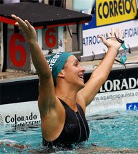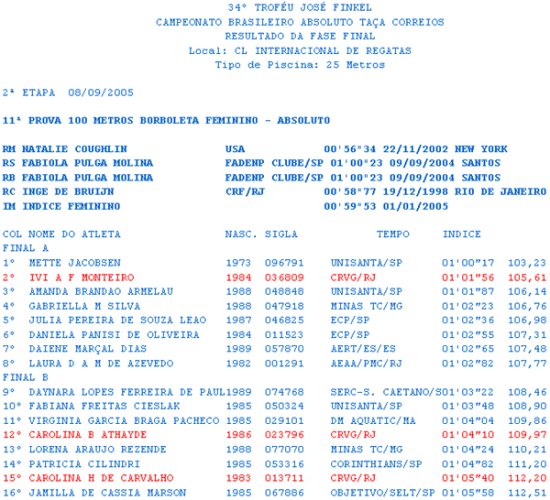 Ivi Monteiro está radiante com o fato de voltar a ser a melhor atleta do Brasil nos 100m Borboleta. Na prova de hoje, ela ficou atrás somente dos 01m00s17 da dinamarquesa Mette Jacobsen, ex-nadadora do Vasco em 1999/2000, que defende o Unisanta atualmente. Carolina Athayde (1m04s10) e Carolina de Carvalho (1m05s40), ambas do Vasco, terminaram respectivamente em 4º e 7º lugares na final B da mesma prova (100m Borboleta), o que corresponde aos 12º e 15º lugares no geral. Confira todos os tempos: ![]() Além dos 100m Borboleta, Ivi Monteiro vai disputar os 50m Borboleta, 100m Borboleta e o Revezamento 4x100m Medley. O Vasco está presente na competição com 8 atletas em 12 provas. Confira: v 1ª ETAPA 07/09/2005 4ª PROVA 200 METROS PEITO MASCULINO - ABSOLUTO RICARDO F A DA SILVA 6ª PROVA 100 METROS MEDLEY MASCULINO - ABSOLUTO BRUNO G BRITO 2ª ETAPA 08/09/2005 11ª PROVA 100 METROS BORBOLETA FEMININO - ABSOLUTO CAROLINA H DE CARVALHO IVI A F MONTEIRO CAROLINA B ATHAYDE 14ª PROVA 50 METROS COSTAS MASCULINO - ABSOLUTO BRUNO G BRITO JOEL F B ALVES 3ª ETAPA 09/09/2005 22ª PROVA 200 METROS COSTAS MASCULINO - ABSOLUTO JOEL F B ALVES 23ª PROVA 50 METROS BORBOLETA FEMININO - ABSOLUTO CAROLINA B ATHAYDE IVI A F MONTEIRO 4ª ETAPA 10/09/2005 27ª PROVA 50 METROS PEITO FEMININO - ABSOLUTO LIVIA P DIAS 29ª PROVA 200 METROS BORBOLETA FEMININO - ABSOLUTO IVI A F MONTEIRO CAROLINA H DE CARVALHO 33ª PROVA REV. 4 X 100 METROS MEDLEY FEMININO - ABSOLUTO CRVG 34ª PROVA REV. 4 X 100 METROS MEDLEY MASCULINO - ABSOLUTO CRVG 5ª ETAPA 11/09/2005 38ª PROVA 100 METROS COSTAS MASCULINO - ABSOLUTO RODRIGO S ALVES BRUNO G BRITO JOEL F B ALVES 40ª PROVA 100 METROS PEITO MASCULINO - ABSOLUTO LEONARDO J DE PAULA Fonte: Site Oficial do Vasco |