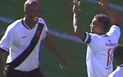 | NETVASCO - 04/12/2005 - 17:53 - Vasco vence o Paraná na última rodada: 3 a 1 39 anos, 22 gols e mais um título na carreira. Estes números resumem o domingo de Romário, que com dois gols chegou à artilharia isolada do Campeonato Brasileiro e ajudou o Vasco a vencer o Paraná por 3 a 1, na última rodada da competição. Com uma grande atuação, o Baixinho ultrapassou Robson, do Paysandu, como artilheiro do Brasileirão, na última rodada. O paraense marcou 21 gols. Romário marcou o primeiro aos 16min do primeiro tempo e o segundo, aos 18min, da segunda etapa. Os dois gols saíram em cobranças de pênalti. O veterano ainda poderia ter marcado mais vezes, já que perdeu duas chances após driblar o goleiro Flávio, ainda na primeira etapa, além de outras chances. No segundo tempo, Porém, a festa vascaína ficou somente por conta de Romário. Precisando de uma combinação de resultados para chegar à Copa Sul-Americana, o time cruzmaltino não teve sorte e ficou fora da competição. Mesmo assim, com 56 pontos, ganhou duas posições, terminando o certame no 12° lugar. Já classificado para a Copa Sul-Americana, o Paraná não conseguiu sua outra meta no Brasileirão. Com a derrota, o time terminou o campeonato empatado em pontos com o Atlético-PR (que também foi derrotado neste domingo), mas perdeu no número de vitórias e não conseguiu ser o melhor paranaense da competição. Por outro lado, o Vasco conseguiu vencer seu campeonato à parte. Com esta vitória e o empate do Flamengo contra o Paysandu, o time de São Januário terminou o certame com três pontos de vantagem para o arqui-rival. O JOGO Precisando vencer para ter chances de se classificar para a Copa Sul-Americana, o Vasco começou o jogo partindo para cima e abriu o placar logo aos 2min. Depois da boa tabela, Romário tocou para Abedi, que driblou o goleiro e abriu o placar. Buscando ser o artilheiro do Brasileirão, Romário desperdiçou uma grande chance de se igualar na artilharia da competição aos 9min. O atacante invadiu a área, passou pelo goleiro, mas tocou na rede pelo lado de fora. Porém, não demorou muito para que o Baixinho conseguisse seu objetivo. Aos 16min, Abedi foi derrubado dentro da área e o árbitro marcou pênalti. Na cobrança, Romário bateu no canto esquerdo de Flávio, que pulou para a direita. Romário ainda perdeu outras chances, deixando de se isolar na artilharia. Aos 19min, Morais tocou para o atacante, que novamente driblou Flavio, mas chutou para fora, rapando a trave. Aos 29min, o Baixinho recebeu livre na área, mas chutou forte, para fora. Aos 38min, o domínio vascaíno que já era grande ficou ainda maior. O lateral-esquerdo Vicente fez falta dura em Wagner Diniz e, como já tinha cartão amarelo, acabou sendo expulso, deixando o Paraná com um jogador a menos. "Perdi gols incríveis. Eu e o gol. Essas coisas assim não têm desculpa. Faltou um pouco de concentração da minha parte. Apesar da idade ainda dá tensão. Vou tentar voltar no segundo tempo mais tranqüilo para fazer os gols, para ser artilheiro e ajudar o Vasco nessa chance que ainda tem na Sul-Americana", prometeu Romário no intervalo. O Paraná voltou melhor para o segundo tempo, partindo para cima. Aos 4min, Parral chutou e Roberto defendeu com o pé. Não demorou muito e o time visitante conseguiu diminuir. Aos 6min, Parral, novamente, driblou Wagner Diniz e bateu cruzado, fazendo o primeiro dos paranaenses. Mas o Vasco voltou a ter o domínio da partida. Aos 13min, Marco Brito foi derrubado na área. Na cobrança, Romário cobrou, Flavio defendeu e, no rebote, o atacante marcou, mas o árbitro mandou repetir a cobrança. O goleiro paranista reclamou muito e, como já tinha amarelo, acabou expulso, deixando seu time com dois jogadores a menos. Tornando-se o artilheiro isolado da competição, Romário repetiu a cobrança e marcou o terceiro gol do time da casa, aos 18min. O atacante ainda fez seu terceiro gol, aos 25min, mas o auxiliar assinalou impedimento inexistente. Aos 33min, a torcida vascaína fez muita festa quando Alex Dias entrou em campo, para completar a festa. O atacante quase marcou no minuto seguinte. O Baixinho ainda deu um susto na torcida. Aos 38min, o veterano caiu fora do gramado, com a mão na virilha. Porém, o jogador voltou ao campo. GALERIA