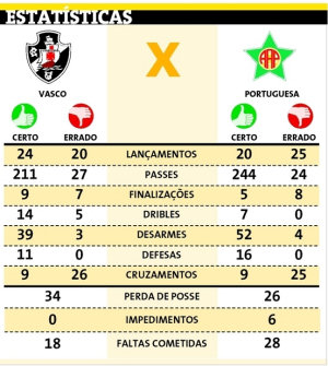 ESTATÍSTICAS ![]() FICHA TÉCNICA VASCO 2 X 2 PORTUGUESA-RJ Competição: Campeonato Estadual (2º Turno - Taça Rio - 1ª Fase - 1ª Rodada). Estádio: São Januário, no Rio de Janeiro (RJ).
