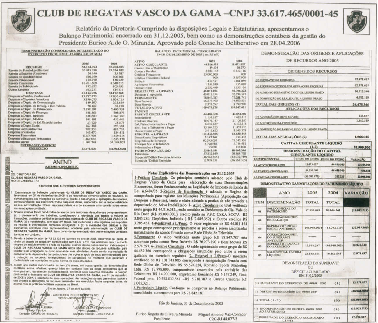 | NETVASCO - 29/04/2006 - 11:56 - Confira o balanço de 2005 publicado pelo Vasco Clique AQUI e confira o balanço de 2005 do Vasco publicado neste sábado no Jornal dos Sports. O balanço é assinado pelo presidente Eurico Miranda e pelo contador Miguel Antônio Vaz. E auditado pela empresa ANEND Auditores Independentes. Veja também: 30/04/2005 - 10:32 - Confira o balanço de 2004 publicado pelo Vasco 06/05/2004 - 07:24 - Confira o balanço de 2003 do Vasco Todas as notícias sobre 'balanço' Fonte: NETVASCO |