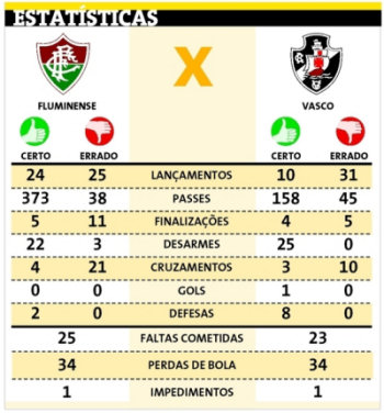 ESTATÍSTICAS ![]() FICHA TÉCNICA FLUMINENSE 0 x 1 VASCO Local: Maracanã (Rio de Janeiro, RJ)