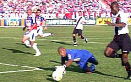 | NETVASCO - 06/08/2006 - 18:01 - Vasco, sem 7 titulares, perde para o Paraná em Curitiba: 2 a 1 Como era de se esperar, o Vasco sentiu os muitos desfalques na tarde deste domingo e saiu de campo derrotado para o Paraná por 2 a 1, no estádio Pinheirão, em Curitiba, em partida válida pela 15ª rodada do Campeonato Brasileiro. Sem contar com quatro titulares suspensos - Cássio, Fábio Braz, Ramón e Morais - e outros dois lesionados - Wagner Diniz e Edílson -, a equipe de São Januário tentou suprir as ausências mostrando disposição, mas sucumbiu após uma falha do goleiro Roberto Ainda na primeira etapa, o arqueiro tentou sair do gol para espalmar um lançamento vindo do meio-campo, mas errou o soco e a bola sobrou fácil para o atacante Sandro anotar. Pouco antes, o meia Abedi chegou a desperdiçar um pênalti, cobrando pela linha de fundo. No segundo tempo, Maicossuel e Madson definiram o marcador. Outro que não pôde atuar pelo time vascaíno foi o meia Ernane, reserva, mas que iria atuar devido aos muitos desfalques. O jogador sofreu uma fratura no pé esquerdo no último treino antes do confronto. O resultado interrompe uma seqüência de três jogos consecutivos com vitórias da equipe carioca, que permanece com 22 pontos ganhos. Já o Paraná se recupera da derrota para o Palmeiras na última rodada e atinge os 27 pontos. Com os reforços dos que não jogaram devido aos cartões, no próximo sábado, o Vasco encara o Juventude mais uma vez longe de seus torcedores. A partida acontece no estádio Alfredo Jaconi, às 16h. Enquanto isso, no domingo, às 18h10, o Paraná recebe o Santos. O JOGO Tentando tirar proveito dos problemas do adversário, o Paraná deu a falsa impressão de que tomaria a iniciativa do confronto. No entanto, a primeira chance real de gol foi do time visitante, em cobrança de falta do volante Andrade, aos 5min, espalmada por Flávio. Mais bem disposto no gramado, a equipe carioca quase saiu na frente aos 11min. O zagueiro Jorge Luiz deu uma de atacante, tabelou com Faioli e saiu na cara do gol. O jogador chegou a passar pelo goleiro paranaense, mas se enrolou com a bola e errou o chute. Aos 17min, o atacante Faioli invadiu a área pela esquerda e foi trombado por Batista. O árbitor Rodrigo Martins Cintra entendeu que o lance foi normal e deu continuidade ao jogo. Na seqüência, o ala Edinho avançou até o bico da grande área e bateu com perigo, à direita de Roberto. A partir daí, o jogo passou a ficar equilibrado, com poucas chances de lado a lado, até que aos 30min, o árbitro marcou pênalti de Emerson sobre o atacante Faioli. Abedi foi para a cobrança, mas, com paradinha e tudo, colocou pela linha de fundo. O lance levou o técnico Renato Gaúcho à loucura e deu novo ânimo ao time paranista. Tanto que no minuto seguinte, após lançamento do meio-campo, o goleiro Roberto saiu do gol estabanado e espalmou a bola nos pés de Sandro, que só teve o trabalho de empurrar a bola para o fundo das redes. Na tentativa de esboçar uma reação, o Vasco teve boa chance por intermédio de Claudemir, aos 38min. No entanto, o ala, de voleio, completou à direita da meta de Flávio. Maicossuel e Leonardo ainda desperdiçaram duas oportunidades para ampliar, mas o primeiro tempo ficou nisso. Na volta para a segunda etapa, o treinador vascaíno tentou modificar o panorama da partida promovendo a entrada do mia Madson na vaga do volante Coutinho. Mas quem assustou foi o Paraná, com Maicossuel, aos 11min, concluindo por cima do gol de Roberto. Equilibrado, o confronto seguiu sonolento até os 23min, quando o meia Maicossuel invadiu a área pela direita, encarou a marcação de Jorge Luiz e bateu com estilo, no ângulo do goleiro Roberto, ampliando o marcador. Com dois gols de desvantagem no placar e poucas opções no banco de reservas, o técnico Renato Gaúcho foi para o tudo ou nada, sacando o zagueiro Paulão e colocando o atacante Luís Carlos. A estratégia ainda surtiu efeito. Prova disso aconteceu aos 40min, quando o meia Madson recebeu bom passe de Faioli e fuzilou o goleiro Flávio, diminuindo a desvantagem. Após o fim do confronto, o volante Andrade foi expulso por excesso de reclamação. GALERIA