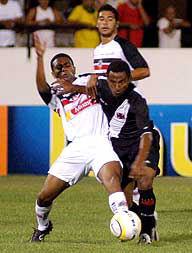 | NETVASCO - 15/10/2006 - 20:04 - VASCO GOLEIA SANTA CRUZ E MANTÉM 6º LUGAR: 4 A 0 O Vasco aproveitou a fragilidade do lanterna Santa Cruz para continuar firme na briga por uma das vagas na Copa Libertadores da América do ano que vem. Na tarde deste domingo, em Recife, a equipe carioca goleou o time pernambucano por 4 a 0, em partida válida pela 29ª rodada do Campeonato Brasileiro. A elástica vitória vascaína colocou o time na sexta colocação, com 44 pontos, cinco a menos do que o Santos, último que garantiria vaga no torneio. Já o clube tricolor se afundou na última colocação, agora a nove pontos da Ponte Preta, primeira equipe fora da zona de rebaixamento da competição nacional. "Foi uma grande vitória, com raça, vontade e, sobretudo, inteligência. Conseguimos explorar o fato de estarmos com um homem a mais", lembrou Leandro Amaral, autor de dois gols, citando a expulsão de Augusto Recife, do Santa Cruz. Do lado pernambucano, nem mesmo a proposta da diretoria, que ofereceu R$ 1 milhão ao elenco caso ele consiga permanecer na elite, deu ânimo. Com a apatia costumeira, o Santa Cruz somou sua 17ª derrota no certame. E dessa maneira, a situação ficou ainda mais complicada. Agora, segundo os matemáticos, o clube nordestino precisa vencer oito das nove partidas que lhes restam no Nacional. Mais do que conseguiu até agora - o time soma seis triunfos. No próximo domingo, o Vasco encara o Palmeiras, em São Januário, às 16h. Tentando o 'milagre' de se livrar da Série B, o Santa Cruz visita o Goiás no mesmo horário, mas no dia anterior. O JOGO Com a obrigação da vitória, o Santa Cruz começou pressionando. No primeiro minuto, Jorge Henrique recebeu na entrada da área e buscou o ângulo esquerdo de Cássio, mas errou o alvo. Aos 5min, em cobrança de falta de Júnior Maranhão, a bola passou na frente de todos os jogadores dentro da área e, caprichosamente, tocou na trave. Após o susto inicial, o Vasco equilibrou as ações e teve duas boas chances com o volante Andrade - uma delas em bola parada. E o time carioca não demorou a abrir o placar. Aos 18min, o zagueiro Fábio Braz aproveitou sobra de novo chute de Andrade, driblou com estilo o goleiro Guto e apenas rolou para o fundo das redes. A partir daí, a equipe pernambucana voltou a pressionar, mas, sem variação de jogadas, buscava os lances de bola aérea. Quando tentou colocar a bola no chão, Bruno Lança concluiu cruzado da entra da área, levando perigo ao gol vascaíno, aos 29min. Mais uma vez Andrade, novamente de bola parada, obrigou Guto a realizar bela intervenção. Em dois lances seguidos, aos 39min, Leandro Amaral e Morais perderam chances para ampliar o marcador ainda na primeira etapa. No último lance do primeiro tempo, Augusto Recife acertou o rosto de Leandro Amaral e foi expulso, dificultando ainda mais a situação do time da casa. "Temos que lutar até o final. Não tem nada perdido", resumiu o atacante Márcio Mixirica. Temendo que o árbitro "compensasse" a expulsão de Augusto Recife, o técnico Renato Gaúcho sacou Andrade, que já tinha o amarelo, e promoveu a entrada de Amaral. 25 a 0: Este foi o placar no quesito passes errados no primeiro tempo 'a favor' do Santa Cruz. Perdida em campo, a equipe pernambucana pecou demais neste fundamento, ao contrário do Vasco. Curiosamente, o êxito da equipe carioca na primeira etapa nega os números estatísticos do Vasco durante a competição nacional. Até a 28ª rodada do Campeonato Brasileiro, o time de São Januário era o terceiro pior em média de acerto de passes, com 77,5%, de acordo com dados do Datafolha. Ao contrário do esperado, a apatia do time pernambucano aumentou na volta para o segundo tempo. Aos 6min, o atacante Leandro Amaral perdeu boa oportunidade ao concluir em cima do goleiro Guto. Três minutos depois, novamente Leandro Amaral apareceu, desta vez passando a bola para chute de Morais. Mais uma vez o arqueiro do Santa Cruz salvou sua equipe. A paciência do técnico Fito Neves com seus atacantes se encerrou aos 13min, quando colocou Elvis e Fabrício Ceará nos lugares de Márcio Mixirica e Nenê. Mas foi o Vasco que continuou no ataque. O meia Morais acertou o travessão de Guto, aos 22min, em chute de longa distância. Aos 29min, Leandro Amaral teve mais uma oportunidade e errou. Depois de muitas tentativas, o atacante Leandro Amaral finalmente marcou o seu. E em dose dupla. Aos 34min, o jogador recebeu passe de Madson, invadiu a área e bateu cruzado, sem chances para Guto. Dois minutos depois ampliou, aproveitando cruzamento de Jean. O próprio Jean ainda teve tempo para encerrar a goleada aos 44min. GALERIA