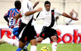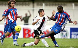 | NETVASCO - 28/01/2007 - 20:05 - VASCO GOLEIA FRIBURGUENSE FORA E É LÍDER ISOLADO: 4 A 1 Com uma atuação consistente neste domingo, o Vasco goleou o Friburguense por 4 x 1, no Estádio Eduardo Guinle, em Nova Friburgo, e abriu vantagem na liderança do Grupo B da Taça Guanabara, primeiro turno do Campeonato Carioca. André Dias, Morais, Leandro Amaral (pênalti) e Abedi fizeram os gols cruzmaltinos, com Sérgio Gomes descontando. Agora com seis pontos, a equipe comandada pelo treinador Renato Gaúcho terá o América como próximo adversário, quarta-feira, dia 7 de fevereiro, às 21h45min, em Edson Passos, pela terceira rodada da competição. Ainda sem pontuar, o time serrano receberá o Volta Redonda, no próximo domingo, às 17 horas. O Vasco assustou primeiro aos oito minutos. Morais fez boa jogada pela direita e cruzou para Conca, livre, completar por cima da meta defendia por Adriano. Aos 16, o argentino levantou para a área e o goleiro do Friburguense fez grande defesa no canto direito. A equipe local só foi chegar com força aos 30, quando Gleison partiu para cima da marcação e bateu forte de canhota, para boa defesa de Cássio a escanteio. O Vasco voltou a carga e quase marcou aos 35, Diego pegou sobra na área e disparou de primeira, mas Adriano salvou, praticando grande intervenção. Aos 38, Conca cobrou falta para a área, Dudar desviou e André Dias cabeceou o vento, perdendo ótima chance para os cruzmaltinos. Aos 41, o atacante desperdiçou a melhor oportunidade da partida até então, ao invadir livre a área, cortar um contrário e finalizar sobre o gol, para desespero de morais que pedia absolutamente desmarcado. Aos 47, o azarado André Dias invadiu pela direita e disparou sobre o gol. Procurando dar mais força ofensiva à sua equipe, o treinador Renato Gaúcho sacou o volante Ives e colocou o apoiador Abeti. Por sua ousadia, acabou premiado aos dois minutos. Conca cobrou falta da direita e André Dias se redimiu das oportunidades perdidas, completando com um lindo peixinho: Vasco 1 x 0. O gol deu mais tranqüilidade a André Dias que, aos 20 minutos, fez boa jogada pela direita e cruzou para Leandro Amaral escorar e Morais completar também de cabeça para a rede. Sem alternativas, a equipe da casa foi para cima e acabou conseguindo diminuir aos 30 minutos. Cássio rebateu, a zaga cruzmaltina falhou na marcação e Sérgio Gomes aproveitou. Aos 38, no entanto, o árbitro William de Souza Nery viu pênalti na disputa entre Crispim e Thiago Maciel. Leandro Amaral cobrou com categoria no canto esquerdo, ampliando a vantagem do Vasco. Logo depois, Cadu fez falta violenta e foi expulso, O Friburguense ainda obrigaria o goleiro Cássio a praticar uma linda defesa após arremate de Ricardinho, aos 39. Porém, aos 44, Abedi trataria de dar números finais, aproveitando bela assistência de Morais. GALERIA