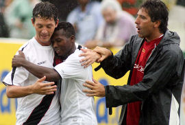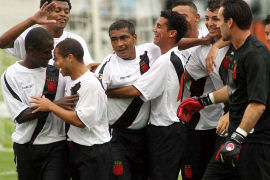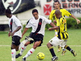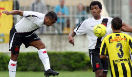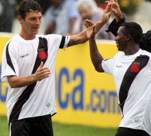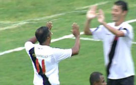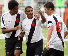 | NETVASCO - 11/02/2007 - 17:59 - ROMÁRIO FAZ 3 E VASCO GOLEIA VOLTA REDONDA: 6 A 1 O Vasco goleou o Volta Redonda por 6 a 1, neste domingo, em São Januário em partida que Romário resolveu voltar a ser aquele artilheiro que encantou o mundo. O Baixinho entrou aos 20 minutos do segundo tempo e nas três oportunidades que teve, não perdoou e balançou a rede. Com isso, faltam dez gols para o camisa 11 vascaíno marcar o seu milésimo na carreira. Leandro Amaral (duas vezes) e André Dias fizeram os outros gols do Vasco. Amaral descontou. Com o resultado, o Vasco chegou a nove pontos está virtualmente classificado para as semifinais da Taça Guanabara. Só uma tragédia tiraria o time da Cruz de Malta da próxima fase, pois teria de ser goleado pelo Fluminense e ainda torcer para o Friburguense, que venceu o Nova Iguaçu por 3 a 2, não golear o América na última rodada. O Volta Redonda entrou na partida disposto a conquistar os três pontos. Mesmo fora de casa, a equipe preta e amarela empurrou o adversário para seu campo defensivo. Até os 15 minutos, o Voltaço dominou. Mas o Vasco tinha a sua maior arma, muito utilizada no ano passado e com sucesso: o contra-ataque. E através de um contra-ataque, iniciado pelo goleiro Cássio, o Vasco abriu o placar. Após chutão de Cássio, André Dias cabeceia e a bola sobra para Leandro Amaral, que disputa a bola com a zaga do Volta Redonda, ganha, e só tem o trabalho de driblar o goleiro para empurrar a pelota para o fundo da rede. Vasco 1 a 0. O gol animou a equipe cruzmaltina, que teve mais duas oportunidades com Leandro Amaral. Do outro lado, o Volta Redonda não se abateu com a desvantagem no marcador e ainda teve boas chances de empatar, não fosse a estrela do goleiro Cássio, que fez, pelo menos, duas grandes defesas. A estratégia do Vasco continuava bem clara. Esperar o adversário no seu campo defensivo e explorar o erro deles para puxar um contra-ataque e tentar ampliar. No primeiro tempo isso não foi possível, mas logo no início da segunda etapa, o Gigante da Colina ampliou. Aos cinco minutos, Abedi cruzou na medida para Leandro Amaral marcar o seu segundo gol na partida e o segundo do Vasco. O gol desanimou a equipe do Volta Redonda, que continou a dar muitos espaços. O Vasco, que não é bobo, nem nada, aproveitou e chegou ao terceiro gol através de André Dias aos 17 minutos. Com o jogo praticamente decidido, Renato Gaúcho promoveu a entrada de Romário aos 20 minutos. Quem pensou que o Vasco iria cozinhar a partida, esperando o apito final se enganou. Isso porque o craque resolveu voltar aos velhos tempos. Em 15 minutos, o baixinho de 1,69m fez três gols - dois de cabeça- e já é um dos artilheiros do Campeonato Estadual. André Dias fez o outro do Vasco e Amaral descontou. Agora, o técnico Renato Gaúcho precisa resolver uma "dor de cabeça". Depois dessa brilhante atuação, o Baixinho deve continuar no banco de reservas? É esperar para ver. GALERIA