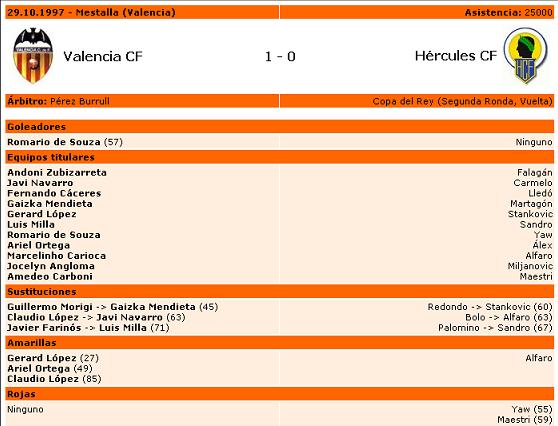 Confira a ficha técnica do jogo Valencia 1 x 0 Hércules, gol de Romário, de acordo com o site "Penya Valencianista", especializado em estatísticas históricas do clube espanhol (link aqui): Fonte: NETVASCO |