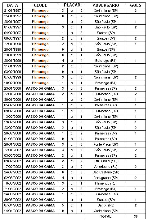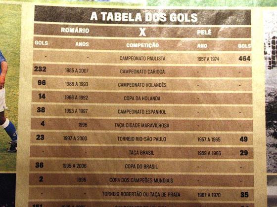 | NETVASCO - 28/03/2007 - 00:25 - PLACAR ERRA; ROMÁRIO TEM 11 GOLS OFICIAIS A MAIS QUE PELÉ A Revista Placar chegou às bancas na última sexta-feira (23/03) prometendo polêmica. Segundo um levantamento feito pela revista, Romário já teria marcado 716 gols em jogos oficiais contra 720 de Pelé, de forma que o Baixinho estaria a apenas quatro de ultrapassar o Rei neste quesito. Placar, porém, cometeu pelo menos dois equívocos em sua pesquisa: 1) atribuiu a Romário apenas 23 gols em Torneios Rio-São Paulo, quando o Baixinho marcou na verdade 36, sendo 25 pelo Vasco e 11 pelo Flamengo; 2) omitiu um gol do Baixinho pela Copa do Rei 1997/1998 (equivalente espanhol à Copa do Brasil), no jogo Valencia 1 x 0 Hércules, disputado em 29/10/1997. Desta forma, e considerando ainda o gol que Romário marcou contra o Flamengo no último domingo (25/03), podemos afirmar que o "Gênio da Grande Área" já balançou as redes 731 vezes em competições oficiais, superando, portanto, o "Atleta do Século" por uma margem de 11 gols. Confira o quadro comparativo em que Placar atribui a Romário apenas 23 gols em Torneios Rio-São Paulo: Clique aqui e confira a relação completa divulgada no site de Placar. Clique aqui para conferir o hotsite original. Confira os jogos e gols de Romário em Torneios Rio-São Paulo, de acordo com a relação de gols do Baixinho disponível no site oficial do Vasco: