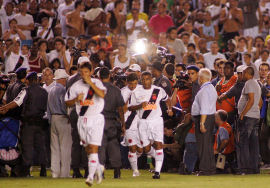 VÍDEO FICHA TÉCNICA VASCO 1 x 2 GAMA Data/hora: 4/4/2007 - 21h45min (de Brasília) Local: Maracanã, Rio de Janeiro (RJ) Árbitro: Evandro Rogério Roman/PR Assistentes: Roberto Braatz/PR e Gilson Bento Coutinho/PR Renda/público: R$ 490.955,00 / 32.681 pagantes Cartões amarelos: Cléber Carioca, Rodrigo Ninja, Dendel (GAM) GOLS: Rodrigo Ninja, 1'/1ºT (0-1); Renato, 15'/1ºT (1-1) e Marcelo Uberaba, 47'/2ºT (2-1) VASCO: Cássio, Wágner Diniz, Fábio Braz, Dudar e Rubens Junior (Guilherme 29'/2ºT); Roberto Lopes, Amaral, Renato (Abedi 22'/2ºT)e Morais (Conca 35'/2ºT; Leandro Amaral e Romário. Técnico: Renato Gaúcho. GAMA: Juninho, Cleber Carioca, Augusto e Denis; Marcio Goiano, Marcelo Uberaba, Valdeir (Lei 26'/2ºT), Rodrigo Ninja e Ricardo Araújo; Neto Potiguar (Dendel 30'/2ºT)e André Borges (Índio 37'/2ºT). Técnico: Gilson Kleina. Fonte: Placar (texto), Lancenet (ficha), VipComm (fotos), GloboEsporte.com (fotos) |