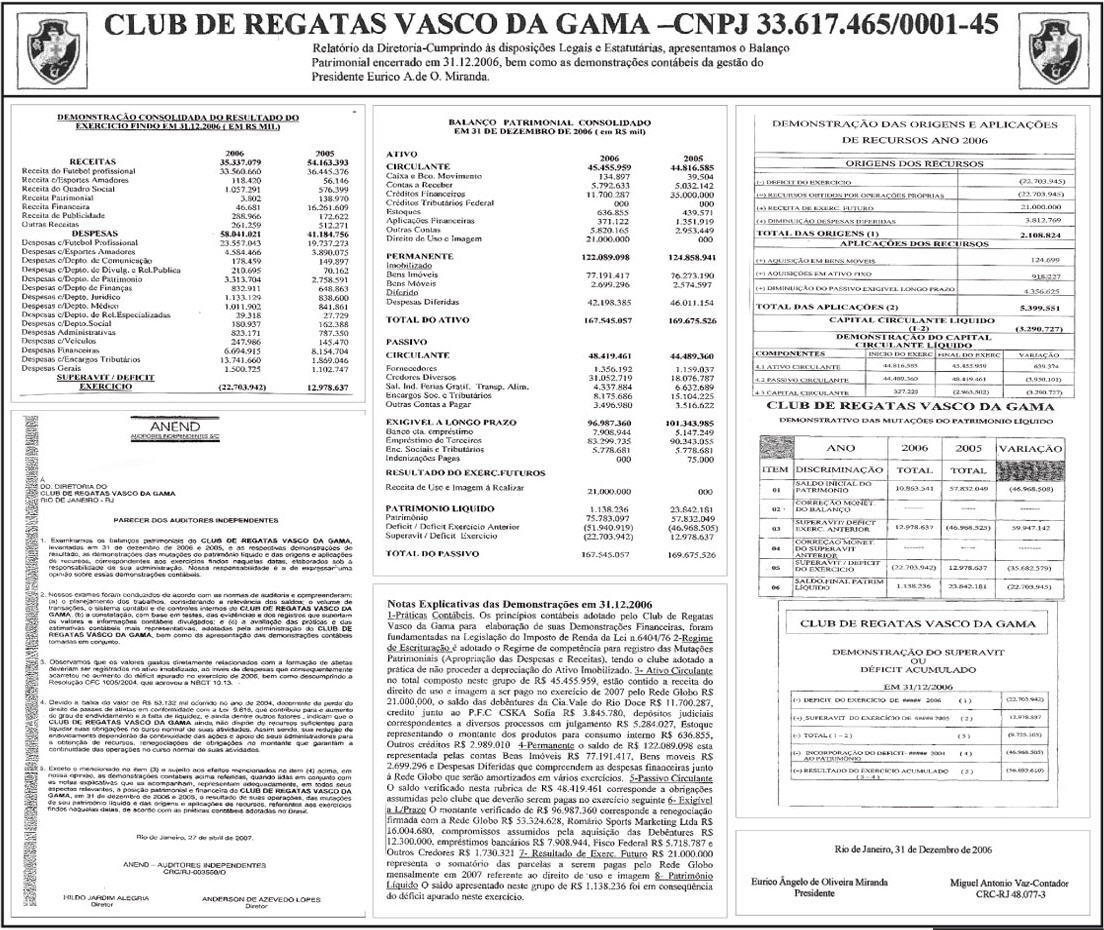 | NETVASCO - 29/04/2007 - DOM - 23:26 - Confira o balanço de 2006 publicado pelo Vasco Clique aqui e confira o balanço de 2006 do Vasco publicado na edição desta segunda-feira (30/04) do Jornal dos Sports. O balanço é assinado pelo presidente Eurico Miranda e pelo contador Miguel Antônio Vaz. E auditado pela empresa ANEND Auditores Independentes. Fonte: NETVASCO Notícias relacionadas: 06/05/2004 - 07:24 - Confira o balanço de 2003 do Vasco 30/04/2005 - 10:32 - Confira o balanço de 2004 publicado pelo Vasco 29/04/2006 - 11:56 - Confira o balanço de 2005 publicado pelo Vasco Todas as notícias sobre 'balanço' |
