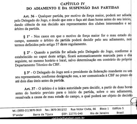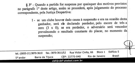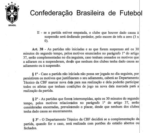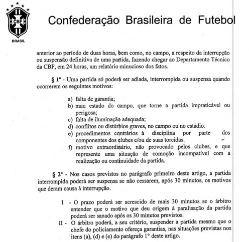 | NETVASCO - 09/06/2007 - 21:02 - Se jogo fosse suspenso, seria reiniciado com Vasco 3 a 0 Quando o árbitro Wilson Luiz Seneme decidiu que iria reiniciar o jogo Vasco 3 x 0 Grêmio, o técnico gremista Mano Menezes declarou ao Sportv: "Ele sabe que está errado. O goleiro deles mesmo disse que não tinha condições mas levou uma pressão do presidente do clube, pois eles sabem que se o jogo fosse suspenso haveria outro jogo." Entretanto, o Regulamento Geral de Competições da CBF diz claramente, em seu artigo 38, que os jogos já iniciados e que tenham sido interrompidos antes dos 30 minutos do segundo tempo devem ser terminados no dia seguinte ou em data a ser marcada pelo Departamento Técnico da CBF: O RGC diz também, no mesmo artigo, que o árbitro pode aguardar até uma hora (30 minutos + 30 minutos) para reiniciar o jogo se entender que o motivo que causou a paralisação pode ser sanado dentro deste período. Como o 2º tempo deveria ter começado às 19h12min (18h10min + 47min do 1º tempo + 15min do intervalo) e começou às 20h05min, não houve desrespeito ao regulamento. Fonte: NETVASCO (texto), Site da CBF (trechos do Regulamento Geral de Competições) |
