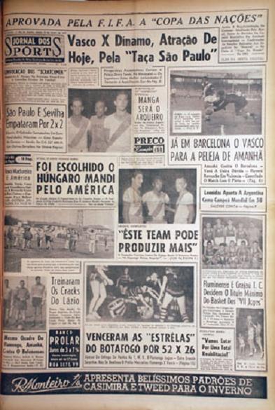 Capa do Jornal dos Sports de 23/06/1957, dia seguinte ao do empate contra o Dínamo de Zagreb