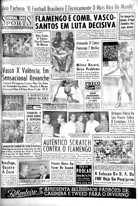 Capa do Jornal dos Sports de 26/06/1957, anunciando o jogo Combinado Vasco-Santos x Flamengo