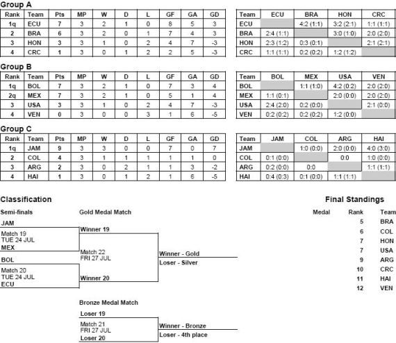 | NETVASCO - 21/07/2007 - 16:52 - Pan 2007: Alex Teixeira marca, mas Brasil perde para 'coroas' e é eliminado O Maracanã quase lotou para ver a seleção sub-17, que estreava no estádio dentro dos Jogos Pan-Americanos. Mas o estádio se esvaziou antes do jogo terminar, quando um Equador sub-20 (ainda com dois adultos) decretou o 4 a 2 que encerrou a campanha brasileira no futebol masculino. Os juvenis ainda tiveram que ouvir o coro de "timinho" e "time sem vergonha". Para as semifinais só classificam as quatro melhores seleções entre as 12 que foram divididas em três grupos na primeira fase do Pan. Jamaica, México, Bolívia e Equador fizeram melhor campanha que o Brasil e vão disputar as medalhas da modalidade. O Brasil começou pressionando, com chute de longe de Fellipe (5min) e cabeçada de Lulinha (7min). O Equador, mais encorpado e experiente, soube equilibrar as ações e levar perigo em contra-ataques. Aos 20min, os juvenis brasileiros quase abriram o placar em cabeçada dupla de Forster e Fábio Silva, que acabou passando próxima à trave. Aos 36min, porém, o time local abriu o placar. Rafael driblou quatro rivais, mas teve a colega rouba por Júnior, que dominou e chutou por baixo do goleiro Banguera, de 22 anos. A vantagem brasileira, porém, demorou pouco. No último minuto antes do intervalo, os visitantes empataram. Após o "veterano" Zura, 24 anos, driblar o colorado Forster e cruzar, Montero empurrou para as redes. Na volta para o segundo tempo, o Equador logo se pôs em vantagem. Outra vez o corpulento Zura fez a diferença. Ele foi lançado, se livrou da marcação e definiu bem logo aos 2min. A partir daí, a sub-17 se lançou ao ataque. Mas o contra-ataque equatoriano foi mortal. Aos 16min, Zura tocou para Montero, que driblou o goleiro Marcelo e mandou para as redes. A partir desse momento, os garotos brasileiros se desesperaram, chuverando bolas na área ou insistindo muito em bolas pelo meio. O momento mais crítico foi na expulsão de Forster, aos 24min, em um revide infantil quando já estava marcada falta para o Brasil. A enfezada torcida no Maracanã fez coro de "burro, burro" para o juvenil. Mas um gol no minuto seguinte deu vida nova para a equipe nacional. A bola cruzou na área para o vascaíno Alex, que diminuiu e foi festejar com o lado do estádio onde tradicionalmente ficam os seguidores de São Januário. O público se inflamou de novo com o 3 a 2. A pressão verde-e-amarela, contudo, era respondida com chances equatorianas, afinal, os contra-ataques sempre pegando dois atletas nacionais contra dois forasteiros. Aos 31min, o juvenil Martinez chutou para fora estando cara-a-cara com o goleiro rival. Aos 38min, Ochoa chutou, a bola desviou na zaga e, caprichosamente, bateu na trave. Aos 40min, finalmente, saiu o gol visitante em contra-ataque, com Ochoa. O 4 a 2 fez boa parte dos torcedores abandonaram seus lugares no estádio. FICHA TÉCNICA BRASIL 2 X 4 EQUADOR Estádio: Estádio do Maracanã, Rio de Janeiro (RJ) Data/hora: 21/7/2007 - 15h (de Brasília) Árbitro: Pablo Lunati (ARG) Auxiliares: Juan Rebollo (ARG) e Patricio Basualdo (CHI) Cartões amarelos: Chango (31'/1ºT) e Banguera (29'/2ºT) (ECU); Fellipe (13'/2ºT) (BRA) Cartão vermelho: Rafael Forster (25'/2ºT) (BRA) GOLS: Junior (37'/1ºT) e Alex Teixeira (26'/2ºT) (BRA); Chasi (45'/1ºT), Zura (2'/2ºT), Montero (17'/2ºT) e Ochoa (41'/2ºT) (EQU). BRASIL: 1-Marcelo, 2-Rafael (15-Bruno Collaço, 43'/2ºT), 6-Fabio Silva (C), 13-Lazaro, 14-Rafael Forster, 8-Giuliano, 7-Fellipe (17-Choco, 18'/2ºT), 10-Lulinha, 9-Maicon, 11-Alex Teixeira, 18-Junior (16-Tales, 12'/2ºT). Não entraram: 12- Renan, 3-Michel Machado, 4-Lucas. Técnico: Luiz Antonio Nizzo. EQUADOR: 1-Maximo Banguera, 2-Wilson Folleco, 3-Deison Mendez, 4-Roberto Castro, 6-Hamilton Chasi, 13-Carlos Delgado (11-Fabricio Guevara, 44'/2ºT), 16-Israel Chango, 5- Jefferson Pinto, 8-Jefferson Montero (7-Jesus Alcivar, 41'/2ºT), 17-Fidel Martinez, 9-Edmundo Zura (C) (18-Pablo Ochoa, 33'/2ºT). Não entraram: 12-German Vera, 10-Alex Alcivar, 14-Alex George, 15-Eduardo Bone. Técnico: Vizuete. Musa do remo vai ao jogo conferir o desempenho dos meninos do futebol ![]() Ela não teve o desempenho que desejava nos Jogos Pan-Americanos, mas nem por isso Fabiana Beltrame deixou de torcer pelo Brasil. A musa do remo fez questão de ver de perto a apresentação dos meninos da seleção brasileira sub-17 de futebol. Ela e o namorado, Gibran Cunha, também remador, estavam acompanhados de amigos e familiares. Mesmo sendo atleta, Fabiana teve que desembolsar R$ 30 pelo ingresso e enfrentar a fila da entrada. - Não conheço quem é quem, mas tem que torcer, né? Afinal é tudo Brasil - confessou a remadora, enquanto esperava para entrar no estádio. ![]() Fonte: UOL (texto), GloboEsporte.com (texto e foto), Site oficial Rio 2007 (ficha e gráfico) |