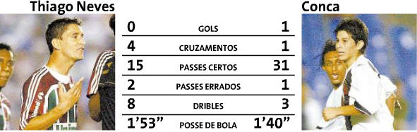 | NETVASCO - 03/09/2007 - 01:29 - 'El Mago' Conca e Thiago Neves, os destaques do clássico Destaques do clássico entre Fluminense e Vasco, os apoiadores Thiago Neves e Darío Conca saíram do banco de reservas para a posição de titulares absolutos em seus times. O pequeno argentino mostrou bastante agilidade em campo e marcou o primeiro gol dele no Maracanã. Já Thiago Neves ganhou mais espaço apenas na segunda etapa do jogo. Numa partida bem corrida, os dois jogadores deram trabalho para os goleiros. Primeiro, Thiago Neves cobrou uma falta, que foi nas mãos de Silvio Luiz. Logo depois, Conca chutou de longe, a bola esbarrou na zaga tricolor e o goleiro Fernando Henrique conseguiu realizar uma defesa espetacular. Aos 38 minutos, o argentino Conca tabelou com Leandro Amaral e chutou forte de longe com a perna esquerda. Foi o quarto gol do camisa 8 do Vasco, no Brasileirão, e o primeiro marcado no Maracanã. O segundo tempo começou com o Fluminense pressionando mais. Por conta disso, o Vasco fechou-se e Conca apareceu menos. Thiago Neves comandava o meio-de-campo do Fluminense. Ele teve outra chance de marcar, quando cobrou uma falta que sofreu aos cinco minutos, mas a bola bateu na trave direita de Silvio Luiz. Conca atrasou uma jogada e foi punido com o cartão amarelo, o terceiro dele na competição. Com isso, o autor do gol vascaíno estará fora da próxima partida. Aos 34 minutos, a pressão tricolor fez efeito: um belo cruzamento de Thiago Neves, terminou na cabeçada de Cícero e veio o empate. Foram dois personagens fundamentais para o resultado do clássico carioca. Thiago Neves não marcou, como Conta, mas deu um presentão para Cícero.
