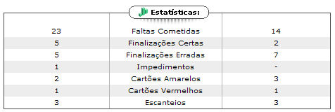 ESTATÍSTICAS ![]() VÍDEO FICHA TÉCNICA GRÊMIO 3 X 1 VASCO Estádio: Olímpico, Porto Alegre (RS) Data/hora: 5/9/2007 - 21h45min Árbitro: José Henrique de Carvalho (SP) Auxiliares: Ednilson Corona (Fifa-SP) e Maria Eliza Correia Barbosa (SP) Renda/público: Não disponíveis Cartões amarelos: Bustos, Hidalgo (GRE); Amaral, Leandro Amaral (VAS) Cartões vermelhos: Labarthe, 9'/2ºT (GRE); Jorge Luiz, 17'/2°T (VAS) GOLS: Bustos, 9'/1ºT (1-0); Alan Kardec, 15'/1ºT (1-1); Ramon, 16'/1ºT (2-1); Sandro Goiano, 24'/2ºT (3-1) GRÊMIO: Saja, Bustos (Patrício - 42'/2°T), Léo, William e Hidalgo; Eduardo Costa, Labarthe, Tcheco (Adilson - 37'/2°T) e Diego Souza; Ramon (Sandro Goiano - 14'/2ºT) e Tuta. Técnico: Mano Menezes. VASCO: Silvio Luiz, Vilson (Leandro Bonfim - 12'/2ºT), Jorge Luiz e Julio Santos; Wagner Diniz, Amaral, Perdigão (Roberto Lopes - 32'/1ºT), Marcelinho e Rubens Júnior; Alan Kardec (Abuda - 32'/2ºT) e Leandro Amaral. Técnico: Celso Roth. Fonte: UOL (texto), Lancenet (ficha), clicRBS (estatísticas e foto), VipComm (fotos), GloboEsporte.com (fotos e vídeo) |