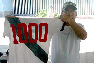 | NETVASCO - 19/11/2007 - 00:00 - Nos 38 anos do 1000º gol de Pelé, a busca pela camisa do Vasco 'perdida' Neste dia 19 de novembro completam-se 38 anos do milésimo gol de Pelé, marcado no jogo Vasco 1 x 2 Santos, no Maracanã. Há quem diga que o gol mil do Rei do Futebol não tenha sido exatamente aquele, preferindo situá-lo um pouco antes ou um pouco depois da partida que acabou entrando para a história do esporte. Mas todos concordam que, após o gol histórico, Pelé vestiu uma camisa do Vasco com o número "1000" às costas e, carregado, deu uma volta pelo gramado. Onde está, hoje, essa camisa histórica? Alguns meses atrás, quando toda a mídia vivia a expectativa do milésimo gol de outro gênio da bola, Romário, surgiu uma pista sobre o paradeiro deste verdadeira relíquia. No dia do jogo Botafogo 2 x 0 Vasco, pelo Campeonato Estadual, um cidadão chamado Henio Barbosa levou ao Maracanã uma camisa bastante parecida com a que Pelé usou naquela noite memorável e contou a seguinte história ao portal GloboEsporte.com: "Ele vestiu e deu uma volta olímpica. Consegui pegar no vestiário, após a partida. Entrei no vestiário e no meio da confusão vi a camisa. Coloquei na bolsa e fui embora." (A íntegra da reportagem ainda pode ser vista através deste link.) ![]() Talvez por se tratar do dia 1º de abril, Dia da Mentira, tudo não tenha passado de uma brincadeira do vascaíno Henio, motivo pelo qual o episódio acabou relegado ao esquecimento. No dia 5 de novembro de 2007, entretanto, mais uma pista da camisa "perdida" apareceu. Pelé visitou a redação do diário Lance e, lá, reencontrou Chico, massagista do Vasco nos anos 60 e 70. Chico mostrou uma camisa também bastante parecida com a que o Rei vestiu após o milésimo gol. (O vídeo pode ser visto clicando-se aqui ou aqui.) Algumas perguntas ainda permanecem no ar no aniversário de 38 anos dessa marca histórica. Qual das camisas é a original? Teriam sido fabricadas duas camisas? Em caso afirmativo, qual delas foi usada por Pelé? E, se nenhuma das duas for a original, onde estará a camisa do Vasco que o Atleta do Século vestiu após marcar seu milésimo gol? Fonte: NETVASCO (texto), GloboEsporte.com (foto), Lancenet/capturada por NETVASCO (fotos) |