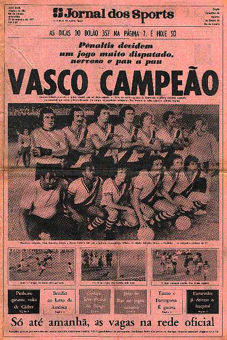 | NETVASCO - 28/09/2007 - 00:00 - Há 30 anos, Vasco vencia Urubu nos pênaltis e era campeão carioca A Nação Vascaína comemora neste dia 28 de setembro de 2007 o trigésimo aniversário da conquista do Campeonato Carioca de 1977. Um título obtido de forma tão inapelável que nem necessidade de uma decisão houve: o Vasco ganhou os dois turnos. Foi, também, a primeira vez na história em que o campeão carioca saiu após uma decisão por pênaltis. Na Taça Guanabara, que equivalia ao primeiro turno do Campeonato Carioca, o Vasco iniciou arrasador: 2 a 1 no Goytacaz, 6 a 0 no Bangu e 4 a 0 no Campo Grande. Na quarta rodada, um acidente de percurso, com a derrota por 1 a 0 para o América - a única em toda a competição. A partir daí foram nove vitórias seguidas (3 a 0 no Olaria, 7 a 1 no Madureira, 3 a 0 no Flamengo, 3 a 0 no São Cristóvão, 1 a 0 no Volta Redonda, 1 a 0 no Fluminense, 3 a 1 na Portuguesa, 2 a 1 no Bonsucesso e 3 a 0 no Americano) até a confirmação do título no triunfo por 2 a 0 sobre o Botafogo, com dois gols do ídolo Roberto Dinamite. o Clube da Colina terminou três pontos à frente do vice-campeão Flamengo e quatro à frente do terceiro colocado Botafogo. Na época, a vitória valia apenas dois pontos. Conquistada a Taça Guanabara, o time partiu para uma excursão às Regiões Centro-Oeste e Sul do Brasil, indo também à França disputar o tradicional Torneio de Paris. No segundo turno, que ganhou o nome de Taça Manoel do Nascimento Vargas Netto, o Vasco realizou uma campanha ainda mais brilhante do que no primeiro, não só vencendo 12 dos seus 14 jogos (empatou com Flamengo e Volta Redonda) como passando todo o turno sem sofrer um mísero gol, façanha que valeu um recorde mundial tanto ao clube quanto ao goleiro Mazzaropi (saiba mais abaixo). Derrotou América, Fluminense, Botafogo e Bangu pelo mesmo placar: 2 a 0. E ainda se deu ao luxo de, em plena disputa, excursionar à Espanha, onde disputou o Torneio Ramón de Carranza, e a Portugal. Mas os 26 pontos obtidos não foram suficientes para garantir o título do returno. Um jogo-extra se faria necessário contra o Flamengo, que somara os mesmos 26 pontos. Se o Vasco vencesse, seria campeão carioca; se perdesse, decidiria o título máximo contra o velho rival. A partida-desempate foi disputada no dia 28 de setembro de 1977, uma quarta-feira, no Maracanã, e registrou a presença de 152.059 pagantes, a maioria deles vascaínos. As duas defesas prevaleceram sobre os ataques e o placar não saiu do 0 a 0 nem no tempo normal, nem na prorrogação de 30 minutos. O segundo turno seria decidido nos pênaltis, a exemplo do que acontecera um ano antes, em 1976, na final da Taça Guanabara, com vitória vascaína. As penalidades seriam batidas do lado da torcida do Vasco. As três primeiras cobranças de cada equipe foram convertidas. No quarto pênalti para o Flamengo, Tita - então um juvenil de 19 anos - chutou para a defesa de Mazzaropi. A seguir, Zandonaide e Zico aproveitaram suas chances, estabelecendo 4 a 4 no placar. Coube, então, a Roberto Dinamite converter o quinto tiro livre para garantir ao Vasco o 14º título carioca de sua história. A SÉRIE INVICTA DO VASCO E DE MAZZAROPI Um ingrediente especial da conquista do Campeonato Carioca de 1977 foi a excepcional série sem sofrer gols do Vasco, que se estendeu por 20 jogos, sendo 18 deles completos, e mais uma prorrogação de 30 minutos, numa duração total de 1.761 minutos, só terminando no Campeonato Carioca de 1978. O extraordinário desempenho da defesa vascaína no Carioca de 1977 resultou na média de 0,17 gol sofrido por jogo, ainda hoje a melhor de todos os tempos no Campeonato Carioca. O gol que iniciou a série foi sofrido aos 13 minutos do 1º tempo do jogo Vasco 2x1 Bonsucesso, em São Januário, em 15/05/1977, na antepenúltima rodada do 1º turno do Campeonato Carioca de 1977.