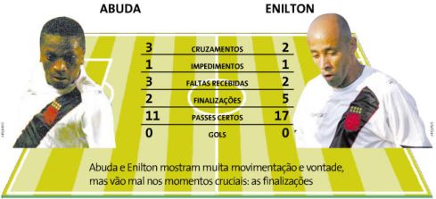 | NETVASCO - 04/10/2007 - 05:58 - Abuda e Enílton, 'ataque cardíaco' contra o Juventude A pouca técnica e a falta de tranqüilidade na hora decisiva foram fundamentais para que Abuda e Enílton passassem em branco na noite de ontem contra o Juventude, em São Januário. No primeiro tempo, a dupla de ataque vascaína até demonstrou disposição e movimentação, porém, nas conclusões, não obteve muito sucesso e foi uma decepção. A primeira grande chance foi de Enílton, que logo no início da partida recebeu cruzamento de Wagner Diniz e, quase na pequena área, cabeceou para a boa defesa de Michel Alves. Abuda só apareceu em condições de marcar aos 34 minutos, mas não teve bom domínio diante do goleiro e deixou a bola escapar. Perto do intervalo, a dupla fez boas jogadas entre si. Na primeira, Enílton serviu Abuda, que chutou sem força, nas mãos do goleiro. Em seguida, a retribuição. Abuda fez ótimo cruzamento para Enílton, mas o atacante não obteve sucesso na cabeçada ao gol. Para a etapa final, a dupla de ataque teve apenas uma oportunidade. Abuda deixou para Enílton, que viu o goleiro adiantado e tentou encobri-lo, porém, sem êxito. Pouco depois, Abuda deu lugar a Alan Kardec e encerrou a sua discreta atuação com apenas duas finalizações. Muito pouco para quem substituía Leandro Amaral. No minuto seguinte à saída de Abuda, Enílton recebeu belo passe de Conca - numa das poucas vezes em que o argentino demonstrou lucidez - e chutou com força para mais uma brilhante intervenção do goleiro do Juventude. Depois que o Vasco tomou o gol de Fábio Baiano, a vida de Enílton ficou mais complicada. Além de ter poucas chances de marcar, o atacante não tinha a colaboração de Alan Kardec, mal no jogo. Ter só raça foi insuficiente. 7 FINALIZAÇÕES fez a dupla Abuda e Enílton durante a partida contra o Juventude. Todas elas sem a precisão ideal. ![]() Fonte: Lance |