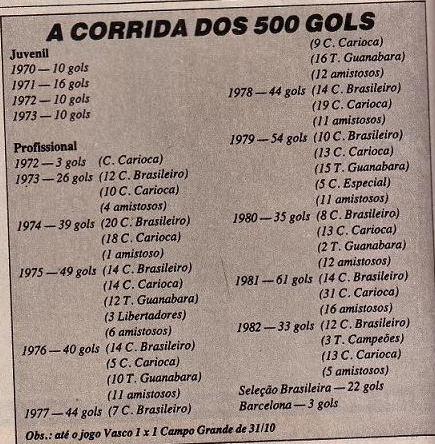 | NETVASCO - 10/11/2007 - 00:00 - Há 25 anos, Roberto Dinamite marcava seu gol de número 500 Num ano em que um dos principais assuntos entre os vascaínos foi a busca de Romário por seu milésimo gol, nada melhor do lembrar que há exatamente 25 anos, em 10 de novembro de 1982, Roberto Dinamite assinalava aquele que foi considerado na época seu tento de número 500. A marca histórica foi alcançada em São Januário, no empate por 1 a 1 contra o Volta Redonda, em jogo do Campeonato Estadual (competição que poucas semanas depois o Gigante da Colina acabaria por conquistar). Um dos trabalhos mais detalhados sobre a vida do grande ídolo vascaíno, o livro "Roberto Dinamite - A Explosão do Gol", de autoria de Edvard Leite de Carvalho, relata o gol histórico da seguinte maneira: O Vasco iria enfrentar o Volta Redonda em São Januário e aqui faltava apenas um para a marca dos 500 gols. Eufórica, a torcida fazia a festa na Colina Histórica (como é conhecido o Estádio de São Januário) e aguarda ansiosa o momento de comemorar o gol de seu artilheiro maior.Pesquisas efetuadas mais recentemente contrariam o levantamento feito à época e fazem surgir a hipótese, bastante provável, de que o 500º gol do maior ídolo do Vasco não tenha sido exatamente esse; mas o fato é que o tento que acabaria acontecendo contra o Voltaço foi aguardado com muita expectativa pelos vascaínos e pela mídia, com direito a contagem regressiva e tudo. E passou para a história como um dos momentos mais marcantes da trajetória de Roberto Dinamite, um dos maiores artilheiros da história do futebol mundial. FICHA TÉCNICA VASCO 1 X 1 VOLTA REDONDA Competição: Campeonato Estadual (2º Turno). Estádio: São Januário, no Rio de Janeiro (RJ). Data: 10/novembro/1982 (quarta-feira). Árbitro: Pedro Carlos Bregalda. Público: 3.491 pagantes. GOLS: Roberto Dinamite (falta) 30'/1ºT (VAS), Luís Alberto 23'/2ºT (VOL). VASCO: Mazarópi; Rosemiro, Nei, Ivan e Pedrinho; Serginho, Dudu e Geovani (Marquinho); Pedrinho Gaúcho, Roberto Dinamite e Palhinha (Ernâni). Técnico: Antônio Lopes. VOLTA REDONDA: Leite; Paulo Verdun, Renato, Luís Cláudio e Ném; Léo Faride, Moreno e Paulo Moretti (Amarildo); Luís Alberto, Eli Mendes e Sivaldo. Técnico: Jorge Vitório. CONTAGEM DOS GOLS Já na época do gol 500 de Roberto Dinamite a Revista Placar contestou a contagem (ver a íntegra da reportagem mais abaixo), descobrindo um tento "perdido" do artilheiro, assinalado numa de suas passagens pela Seleção Brasileira, e considerando que a marca histórica teria sido quebrada não em 10/11 mas em 31/10, no empate por 1 a 1 contra o Campo Grande: Uma análise mais detalhada feita posteriormente mostrou, no entanto, algumas omissões da Revista Placar, como a do famoso gol de Dinamite em 1971, contra o Internacional, justamente o seu primeiro no time profissional do Vasco, e de três gols do atacante pela Seleção Brasileira, incluindo um pela Seleção Olímpica (o trabalho mais recente a respeito do assunto - Assaf & Napoleão, Seleção Brasileira 1914-2006, Ed. Mauad - credita 26 gols a Dinamite pela "Amarelinha" e não 23). Por outro lado, dos 46 gols que Placar concede a Roberto Dinamite como atleta das categorias de base do Vasco, apenas 26 puderam ser localizados consultando-se as fichas do jogador nos CDs da série "Arquivos de São Januário", lançados em 2002. Não há dados oficiais digitalizados disponíveis sobre a carreira amadora de Dinamite na maior parte de 1972 e no ano de 1973 inteiro. Desta forma, a única certeza que se pode ter acerca do 500º gol de Roberto Dinamite é a de que fixar a data exata em que ele ocorreu demandará ainda pesquisas mais aprofundadas sobre a trajetória do jogador especialmente no que diz respeito aos anos em que ele atuou como amador no Vasco. REPORTAGEM Reportagem da Revista Placar sobre os 500 gols de Roberto Dinamite: ÁUDIO (clique nos links para ouvir o MP3) Gol 497 - 17/10/1982 - Vasco 3 x 2 Fluminense - de falta - Narração: Jorge Curi - Rádio Globo Gol 498 - 17/10/1982 - Vasco 3 x 2 Fluminense - de pênalti - Narração: Waldir Amaral - Rádio Globo Gol 499 - 31/10/1982 - Vasco 1 x 1 Campo Grande - de falta - Narração: César Rizzo - Rádio Globo Gol 500 - 10/11/1982 - Vasco 1 x 1 Volta Redonda - de falta - Narração: Édson Mauro - Rádio Globo