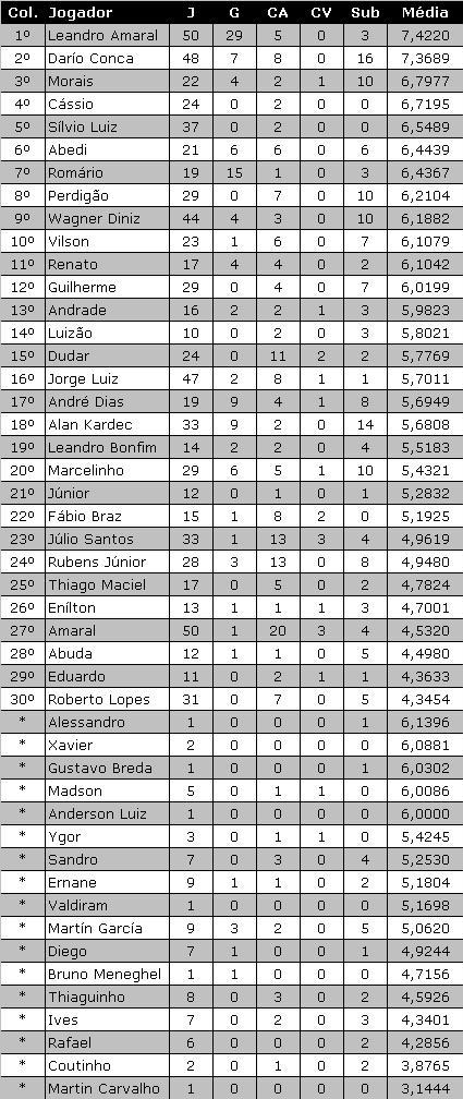 O segundo colocado foi o apoiador argentino Darío Conca, que obteve média 7,3689 em 48 partidas disputadas. Já a terceira posição ficou com o também armador Morais, que, em 22 jogos, conseguiu média 6,7977. Dois goleiros, Cássio e Silvio Luiz, completam a relação dos cinco primeiros colocados. Com o título do TROFÉU NETVASCO 2007, Leandro Amaral junta-se a um grupo seleto de que fazem parte Jean (vencedor em 2006), Alex Dias (vencedor em 2005) e Muriqui (vencedor em 2004), todos, coincidentemente, atacantes. Em relação ao desempenho dos atletas em cada competição da temporada, Leandro Amaral foi considerado o melhor jogador nos certames do primeiro semestre (Campeonato Estadual e Copa do Brasil) e Darío Conca nos do segundo semestre (Campeonato Brasileiro e Copa Sul-Americana). Um total de 81.390 avaliações foram feitas nos 61 jogos oficiais do Vasco na temporada, média superior a 1.300 por partida. Ao todo, 47 jogadores tiveram suas atuações avaliadas pelos freqüentadores da NETVASCO, embora somente os 30 que entraram em campo dez ou mais vezes tenham obtido classificação final. Resultado final do TROFÉU NETVASCO 2007 Vencedores por competição CAMPEONATO ESTADUAL (Resultado completo) 1º Leandro Amaral 2º Alan Kardec 3º Cássio COPA DO BRASIL (Resultado completo) 1º Leandro Amaral 2º Alan Kardec 3º Marcelinho CAMPEONATO BRASILEIRO (Resultado completo) 1º Darío Conca 2º Morais 3º Leandro Amaral COPA SUL-AMERICANA (Resultado completo) 1º Darío Conca 2º Leandro Amaral 3º Cássio Fonte: NETVASCO |