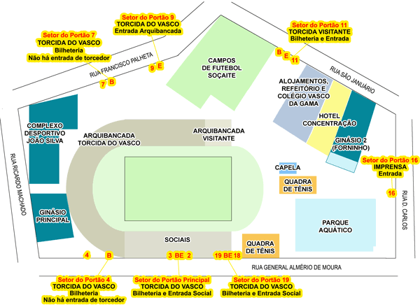 Endereço: Rua General Almério de Moura, 131, Vasco da Gama, Rio de Janeiro (RJ) Capacidade: 35.000 lugares Dimensões do campo: 100m x 70m Como chegar: ônibus: 209, 472 e 473 Clique aqui e confira o mapa das entradas do estádio. Preliminar: 19h30 - Vasco x Resende - Campeonato Estadual de Juniores Tempo: Previsão: 23ºC - Trovoada esparsa Possibilidade de chuva: 50% Arbitragem: Árbitro: João Batista de Arruda (RJ)