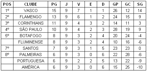 TABELA COMPLETA 26/02 - Palmeiras 2x1 Fluminense, América 3x5 Santos 27/02 - Botafogo 3x2 Corinthians, São Paulo 2x3 Flamengo 01/03 - Palmeiras 4x2 Vasco, América 2x1 Portuguesa 02/03 - Fluminense 2x1 São Paulo, Santos 1x1 Botafogo 05/03 - Flamengo 4x2 Portuguesa, Corinthians 1x3 Vasco 06/03 - Santos 7x6 Palmeiras, Fluminense 3x1 América 08/03 - Portuguesa 2x1 Botafogo, Vasco 3x2 São Paulo 09/03 - Fluminense 1x1 Corinthians, Santos 2x3 Flamengo 12/03 - Botafogo 7x3 América, São Paulo 5x2 Palmeiras 13/03 - Vasco 6x1 Fluminense, Portuguesa 3x2 Santos 15/03 - Corinthians 2x1 Palmeiras, América 3x2 Flamengo 16/03 - Botafogo 1x1 Fluminense, São Paulo 4x2 Santos 19/03 - Palmeiras 3x0 Portuguesa, Vasco 1x0 América 20/03 - Flamengo 4x0 Botafogo, Corinthians 1x1 São Paulo 22/03 - Vasco 1x0 Santos, Portuguesa 0x1 Fluminense 23/03 - Flamengo 6x2 Palmeiras, Corinthians 2x1 América 26/03 - Vasco 4x2 Botafogo, São Paulo 4x4 Portuguesa 27/03 - Flamengo 1x0 Fluminense, Corinthians 2x1 Santos 29/03 - Botafogo 3x2 Palmeiras, São Paulo 4x0 América, Vasco 1x1 Flamengo 30/03 - Corinthians 0x0 Portuguesa 01/04 - Palmeiras 0x2 América 02/04 - Corinthians 3x0 Flamengo 05/04 - Santos 3x0 Fluminense 06/04 - Botafogo 2x5 São Paulo, Portuguesa 1x5 Vasco CLASSIFICAÇÃO FINAL