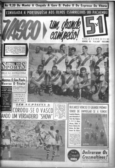 O Jornal dos Sports de 7 de abril de 1958 relatou o jogo da seguinte maneira: "Os primeiros movimentos da partida deram logo a impressão de uma superioridade nítida do Vasco da Gama. E mal a Portuguesa havia firmado o pé no terreno num fechar de olhos, já havia levado dois gols. Foi uma verdadeira 'blitz'. E, mais uma vez, viu-se em grande destaque este garoto corajoso que é Almir. Os dois primeiros gols tiveram participação efetiva do pernambucano. No gol inaugural, Almir achou Vavá que fuzilou o goleiro Carlos Alberto. No segundo tento, ele entrou como um raio à frente de Sabará após bom lançamento de Pinga. Em cinco minutos, o Vasco vencia por 2 x 0. O terceiro gol marcado por Almir foi o mais bonito da peleja. O jovem de 18 anos driblou três defensores e o goleiro. E quando o último zagueiro da Lusa ficou sobre a linha do gol para tentar salvar, Almir apenas rolou a bola no canto esquerdo. A Portuguesa marcou seu gol de honra por intermédio de Ocimar que encobriu o goleiro Barbosa. Neste momento, a peleja já estava liqüidada e o Vasco vencia por 4 x 0. Antes do apito final do juiz para a comemoração dos cruzlmatinos, o Vasco ainda marcou mais um gol através do melhor jogador da partida, o permabuncano Almir, que marcou três dos cinco gols do Vasco e ainda deu um passe com afeto para seu conterrâneo Vavá abrir o marcador." No dia seguinte, 8 de abril de 1958, o mesmo veículo continuou a falar sobre o título vascaíno: "Desde domingo, o Torneio Rio-São Paulo, tem novo campeão - e que campeão! Coube, este ano, ao Vasco da Gama levantar o título na brilhante campanha, só mesmo obscurecida por um único resultado negativo, justamente aquele que deu ao Palmeiras, um dos lanternas da tabela, a satisfação de alcançar, talvez, um de seus raros e honrosos triunfos no campeonato. Campeão de nove batalhas arduamente cumpridas - sete vitórias, um empate e uma derrota acidental- eis como o Vasco se retrata com fidelidade na galeria dos campeões deste torneio que ascendem a oito, de 1950 a 1958. Pela segunda vez consecutiva, um clube carioca interrompe a série quase dezena de vitórias paulistas, no afã de recuperar para o Rio de Janeiro a hegemonia do football nacional. Ainda no 'onze' campeão, iremos encontrar os dois extremos do torneio: o mais velho e o mais novo dos cracks que a ele concorreram. Assim, o título de broto pertence ao 'pernambuquinho' Almir, e o de vovô continua em poder de Barbosa". FICHA TÉCNICA
