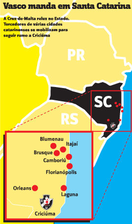 Dentro do próprio elenco do Gigante da Colina existe um representante dos torcedores do estado: o goleiro Roberto. Vascaíno confesso, o jogador nasceu em Orleans, cidade com população de aproximadamente 30 mil habitantes que fica a cerca de 30 quilômetros de Criciúma. Sem medo de errar, ele confia na força da torcida. – O Vasco é muito popular em todo o estado. A minha cidade é dividida entre torcedores do Vasco e do Flamengo. Tenho certeza de que a parte reservada no Heriberto Hulse para os que irão nos apoiar estará completamente lotada – destacou Roberto. No site de relacionamentos Orkut, torcedores de várias cidades de Santa Catarina, como Blumenau, Florianópolis e Balneário Camboriú, estão se programando para viajar até Criciúma para apoiar o Vasco diante de um adversário que encara a partida como a mais importante do ano. Precisando de uma vitória para se classificar, o Tigre deve partir para o ataque desde o início. – A Copa do Brasil é para o Criciúma a mesma coisa do que a Libertadores é para o Vasco. Eles dão a vida nesta competição. Para se ter uma idéia, a torcida muda até de comportamento e costuma apoiar o time durante todo o jogo, não importando o placar – explicou Roberto, que defendeu o Criciúma entre 1999 e 2002 e em 2004 e 2005. Fonte: Lance |