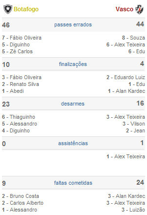 Gols: Eduardo Luiz 55"/1ºT (0-1) e Lucio Flavio 41'/2ºT (1-1) BOTAFOGO: Renan; Alessandro, Renato Silva, Bruno Costa e Zé Carlos (Alexandro 24'/2ºT); Thiaguinho, Túlio (Lucio Flavio 17'/2ºT), Diguinho e Abedi (Jorge Henrique, intervalo); Carlos Alberto e Fábio. Técnico: Cuca. VASCO: Roberto; Vilson, Eduardo Luiz e Luizão; Eduardo, Pablo, Souza, Alex Teixeira (Victor 27'/2ºT) e Valmir (Bruno Gallo 5'/2ºT); Jean (Villanueva, intervalo) e Alan Kardec. Técnico: Antônio Lopes. ESTATÍSTICAS