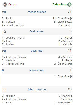 GOLS: Alex Mineiro (cabeça) (PAL) 36'/1ºT (0-1); Kléber (PAL) 30'/2ºT (0-2) VASCO: Roberto; Eduardo Luiz, Anderson e Rodrigo Antônio; Wagner Diniz, Jonílson (Alex Teixeira 36'/2ºT), Pablo, Vinícius Reche (Alan Kardec, intervalo) e Madson (Bruno Gallo 24'/2ºT); Jean e Leandro Amaral. Técnico: Antônio Lopes. PALMEIRAS: Marcos; Elder Granja, Gustavo, Henrique e Leandro; Pierre, Martinez, Diego Souza (Léo Lima 34'/2ºT) e Valdivia (Denilson 35'/2ºT); Kléber e Alex Mineiro (Lenny 33'/2ºT). Técnico: Vanderlei Luxemburgo. ESTATÍSTICAS ![]() TROFÉU NETVASCO 2008