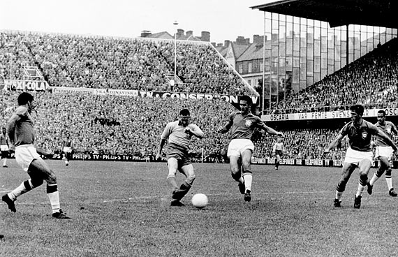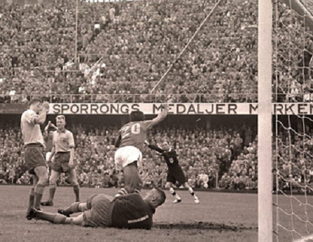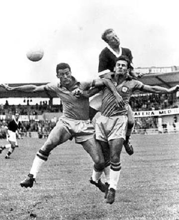 2º jogo: BRASIL 0 X 0 INGLATERRA (1ª fase) No dia 11 de junho de 1958, em Gotemburgo. Dida [Flamengo] foi barrado por Vavá [Vasco]. Mazzola [Palmeiras], que havia se contundido no jogo contra a Áustria, atuou sem estar 100% recuperado. Pelé [Santos], ainda machucado, e Garrincha [Botafogo], continuavam na reserva. O Brasil jogou, portanto, com 3 jogadores do Vasco, 2 do Flamengo, 2 do Botafogo, 2 do São Paulo, 1 do Corinthians e 1 do Palmeiras: Gilmar [Corinthians]; De Sordi [São Paulo], Bellini (cap) [Vasco], Orlando Peçanha [Vasco] e Nílton Santos [Botafogo]; Dino Sani [São Paulo] e Didi [Botafogo]; Joel [Flamengo], Mazzola [Palmeiras], Vavá [Vasco] e Zagallo [Flamengo]. Técnico: Vicente Feola. O jogo terminou num empate sem gols. Foi o primeiro 0 a 0 da história das Copas do Mundo. Vavá [Vasco], considerado pela imprensa o melhor jogador brasileiro em campo, foi quem chegou mais perto do gol ao chutar uma bola na trave aos 30 minutos do primeiro tempo. A Inglaterra jogou com Colin McDonald; Don Howe e Tommy Banks; Eddie Clamp, Billy Wright (cap) e Bill Slater; Bryan Douglas, Bobby Robson, Derek Kevan, John Haynes e Alan Court. Técnico: Walter Winterbottom. O público foi de 30.000 espectadores. O árbitro foi Albert Dusch (Alemanha Ocidental), auxiliado por Bertil Loeoew (Suécia) e Istvan Zsolt (Hungria). No outro jogo do grupo, a União Soviética venceu a Áustria por 2 a 0. ![]() 3º Jogo: BRASIL 2 X 0 UNIÃO SOVIÉTICA (1ª fase) Disputado no dia 15 de junho de 1958, em Gotemburgo. O Brasil entrou em campo com três alterações: Zito [Santos] no lugar de Dino Sani [São Paulo], Garrincha [Botafogo] no lugar de Joel [Flamengo] e Pelé [Santos], então com 17 anos, no lugar de Mazzola [Palmeiras]. A Seleção Brasileira jogou com 3 jogadores do Vasco, 3 do Botafogo, 2 do Santos, 1 do Flamengo, 1 do São Paulo e 1 do Corinthians: Gilmar [Corinthians]; De Sordi [São Paulo], Bellini (cap) [Vasco], Orlando Peçanha [Vasco] e Nílton Santos [Botafogo]; Zito [Santos] e Didi [Botafogo]; Garrincha [Botafogo], Vavá [Vasco], Pelé [Santos] e Zagallo [Flamengo]. Técnico: Vicente Feola. O Brasil deu um show contra o time do goleiro Yashin, o "Aranha Negra", até hoje considerado o melhor arqueiro de todos os tempos. Somente nos dois primeiros minutos de jogo houve uma bola na trave de Garrincha [Botafogo], uma bola no travessão de Pelé [Santos] e finalmente o gol de Vavá [Vasco]. No segundo tempo, Vavá [Vasco] voltou a balançar as redes aos 20 minutos. No lance do gol, o artilheiro vascaíno sofreu uma entrada dura do soviético Boris Kuznetsov em seu tornozelo direito e passou a preocupar a comissão técnica para os jogos seguintes da Copa do Mundo. A URSS jogou com Lev Yashin; Vladimir Kessarev e Boris Kuznetsov; Juri Voinov, Konstantin Kriglevski e Viktor Tsarev; Alexander Ivanov, Valentin Ivanov, Nikita Simonian, Igor Netto (cap) e Anatoli Ilin. Técnico: Gavril Katchalin. O público foi de 50 mil espectadores. O árbitro foi Maurice Guigue (França), auxiliado por Carl Jörgensen (Dinamarca) e Birger Nielsen (Noruega). No outro jogo do grupo, Inglaterra e Áustria empataram por 2 a 2. O Brasil ficou com a primeira colocação do Grupo 4. Num jogo-desempate, a URSS venceu a Inglaterra por 1 a 0 e ficou com a segunda vaga. ![]() ![]() ![]() 4º Jogo: BRASIL 1 X 0 PAÍS DE GALES (quartas-de-final) No dia 19 de junho de 1958, em Gotemburgo. A única alteração na Seleção foi a entrada de Mazzola [Palmeiras] no lugar de Vavá [Vasco] devido à contusão do vascaíno no tornozelo direito, fruto da entrada de um zagueiro adversário no lance do segundo gol contra a URSS (após a partida, o jogador, Boris Kuznetsov, foi à concentração do Brasil pedir desculpas pela entrada). O Brasil jogou, portanto, com 3 jogadores do Botafogo, 2 do Vasco, 2 do Santos, 1 do Flamengo, 1 do São Paulo, 1 do Palmeiras e 1 do Corinthians: Gilmar [Corinthians]; De Sordi [São Paulo], Bellini (cap) [Vasco], Orlando Peçanha [Vasco] e Nílton Santos [Botafogo]; Zito [Santos] e Didi [Botafogo]; Garrincha [Botafogo], Mazola [Palmeiras], Pelé [Santos] e Zagallo [Flamengo]. Técnico: Vicente Feola. A seleção do País de Gales, mesmo cansada por ter enfrentado um jogo-desempate contra a Hungria (venceu por 2 a 1) dois dias antes, pela 2ª colocação do Grupo 3, enquanto o Brasil teve quatro dias para descansar, resistiu bravamente ao poderoso ataque brasileiro. Mas caiu aos 21 minutos do 2º tempo com um gol do garoto Pelé [Santos]. O Brasil estava na semifinal da Copa do Mundo. O País de Gales jogou com Jack Kelsey; Stuart Williams e Melvyn Charles; Melvin Hopkins, Derek Sullivan e David Bowen (cap); Terence Medwin, Ronard Hewitt, Colin Webster, Ivor Allchurch e Clifford Jones. Técnico: Jimmy Murphy. O público foi de 25.000 torcedores. O árbitro foi Friedrich Seipelt (Áustria), auxiliado por Albert Dusch (Alemanha Ocidental) e Maurice Guigue (França). Os resultados das outras quartas-de-final foram: Suécia 2 x 0 URSS, Alemanha Ocidental 1 x 0 Iugoslávia e França 4 x 0 Irlanda do Norte. A França seria a adversária do Brasil na semifinal. ![]() 5º jogo: BRASIL 5 X 2 FRANÇA (semifinal) Em 24 de junho de 1958, em Estocolomo, capital da Suécia. O Brasil teve uma única alteração no time: a saída Mazzola [Palmeiras] para a volta de Vavá [Vasco], que no entanto ainda não estava totalmente recuperado da contusão no jogo contra a URSS. A Seleção jogou, portanto, com 3 jogadores do Vasco, 3 do Botafogo, 2 do Santos, 1 do Flamengo, 1 do São Paulo e 1 do Corinthians: Gilmar [Corinthians]; De Sordi [São Paulo], Bellini (cap) [Vasco], Orlando Peçanha [Vasco] e Nílton Santos [Botafogo]; Zito [Santos] e Didi [Botafogo]; Garrincha [Botafogo], Vavá [Vasco], Pelé [Santos] e Zagallo [Flamengo]. Técnico: Vicente Feola. O Brasil não se intimidou com o melhor ataque da Copa (15 gols em 4 jogos até então) nem com o artilheiro Just Fontaine (que já tinha assinalado 7 gols até o 