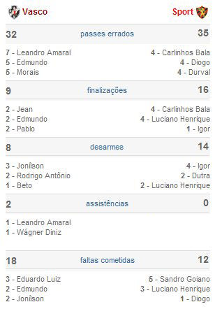 FICHA TÉCNICA VASCO 4 X 0 SPORT Competição: Campeonato Brasileiro - 10ª rodada Estádio: São Januário, Rio de Janeiro (RJ).