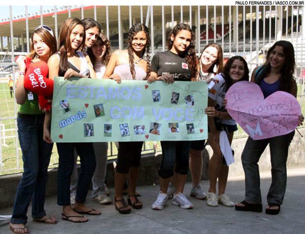 O meio-campo Morais teve total apoio da torcida no treinamento deste sábado (02/08) em São Januário. Pela manhã, cerca de dez meninas do fã-clube do jogador compareceram ao estádio com cartazes de incentivo ao atleta. - Estamos sempre com ele até o final, não importa o que acontecer! Nós o amamos muito e não queremos que ele saia - disse a torcedora Mayara Leal, de 15 anos. ![]() Fonte: Site oficial do Vasco |