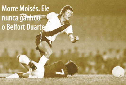 Também alcançou destaque como treinador. Especialmente no comando do Bangu. Em 1985, levou a equipe carioca ao vice-campeonato brasileiro. Apesar do estilo duro em campo, fora dele era conhecido pelo bom humor. Gostava muito de Carnaval e ajudou a fundar o "Bloco das Piranhas", no qual jogadores de futebol desfilavam vestidos de mulher por ruas da Zona Norte do Rio. O corpo do ex-jogador foi enterrado no Cemitério São João Batista, em Botafogo (Zona Sul do Rio), no final da tarde desta terça-feira. Fonte: GloboEsporte.com ![]() Time campeão brasileiro de 1974 Nome: Moisés Matias de Andrade Nascimento: 30/11/1948, Resende-RJ Período: 1971 a 1975 Posição: Zagueiro Zagueiro que se preza nao pode ganhar o Belfort Duarte. Assim falava Moisés, referindo-se ao prêmio dado a jogadores que passam dez anos sem serem expulsos de campo. Zagueiro duríssimo, não hesitava em apelar para a violência. Mas era bastante seguro e sabia jogar, tendo formado com Miguel ou Renê verdadeiras muralhas na defesa do Vasco. Certa vez, deslocado para a lateral esquerda numa final de turno contra o Flamengo em 1975, Moisés mostrou que também sabia apoiar, fazendo o gol da vitória por 1 a 0. Fonte: Site Mauro Prais ![]() O Vasco de 1972, o último time de Tostão antes de encerrar a carreira. Em pé estão Andrada, Puruca, Alcir, Moisés, Miguel e Eberval; agachados vemos Jorginho Carvoeiro, Buglê, Silva, Tostão e Ademir. ![]() Fonte: Site Milton Neves ![]() ![]() Fonte: Jornal dos Sports (edição de 27/08/2008) |