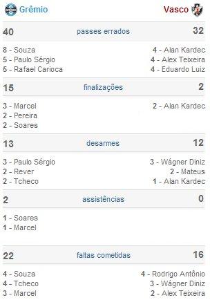Com o estádio Olímpico cheio, o Grêmio derrotou o Vasco por 2 a 1 e segue líder do Campeonato Brasileiro, com cinco pontos de vantagem para o segundo colocado. O Tricolor dominou a partida, mas teve dificuldades para vencer a esforçada equipe cruzmaltina. Marcel e Soares (que entrou no lugar de Perea durante o jogo) foram os principais responsáveis pela vitória gremista, marcando um gol e dando uma assistência cada um. Alan Kardec diminuiu o marcador para os cariocas. Na próxima rodada, os dois clubes jogam no Rio de Janeiro. Na quinta-feira, o Vasco recebe o Cruzeiro em São Januário, às 20h30m, enquanto o Grêmio encara o Fluminense, no Maracanã, no sábado, às 18h20m. O JOGO Vindo de dois resultados ruins no Brasileirão e da desclassificação na Copa Sul-Americana para o rival Inter, o Grêmio tratou de partir para cima do Vasco logo no início da partida. Aos 2m, Perea tabelou com Tcheco e quase abriu o placar da partida. A resposta do Vasco só veio aos 10, quando Jean fez boa jogada pela direita, Rodrigo Antônio se antecipou aos zagueiros tricolores, mas chutou desequilibrado. Dois minutos depois, Souza chutou bonito de fora da área, mas Tiago fez uma grande defesa, impedindo que a bola chegasse à sua meta. Depois desse lance, a partida caiu consideravelmente de qualidade. O Grêmio não conseguia furar a defesa do Vasco que, por sua vez, pouco se arriscava ao ataque. Aos 37, Jorge Luiz e Perea disputaram uma bola, com o vascaíno levando vantagem. O atacante gremista sentiu dores e precisou ser atendido. Na seqüência da jogada, Alan Kardec invadiu a área, mas foi brecado pela defesa. Sem conseguir continuar em campo, Perea deu lugar a Soares. Na última chance da primeira etapa, Anderson Pico teve ótima chance para abrir o placar para o Grêmio. Aos 45, em uma bate-rebate na área, a bola sobrou para o lateral que a chutou para fora. - O Roth pediu para a gente jogar do mesmo jeito, mas para ter um pouco mais de paciência – disse Tcheco, ao voltar para a segunda etapa do jogo. O conselho do comandante gremista parece ter dado resultado. O Tricolor voltou mais agressivo no ataque, tentando aproveitar melhor as chances criadas. Aos 2, Souza pediu pênalti em disputa de bola com Edu, mas o juiz interpretou acertadamente que o zagueiro vascaíno tinha acertado primeiro a bola. Sete minutos depois, porém, o lateral cruzmaltino nada pôde fazer. Marcel recebeu a bola pela direita partiu para o ataque e cruzou na medida para Soares, de cabeça, fazer a festa da torcida gremista no Olímpico. O gol deu nova movimentação ao jogo. Em desvantagem no placar, o Vasco passou a buscar mais o ataque, mas esbarrava nas suas limitações e nas muitas faltas cometidas pelo Grêmio. Com isso, a equipe da casa teve mais espaço para trabalhar a bola em seu campo ofensivo, criando mais chances. Em uma delas, aos 20, o time conseguiu marcar o segundo tento, mas o bandeirinha já havia marcado impedimento no lance. Aos 25, André Luiz, que substituira Anderson Pico, cometeu falta grosseira em Jean. Edu cobrou para a área e Alan Kardec subiu mais que toda a zaga para empatar a partida. Contudo, a felicidade vascaína durou muito pouco. Três minutos depois, o Grêmio cruzou da esquerda e Soares retribuiu o passe para Marcel deixando o artilheiro livre para colocar o líder mais uma vez em vantagem na partida. O Vasco não conseguia reagir, e poucas vezes chegou ao campo de ataque. Em uma dessas raras ações ofensivas, André Luis fez falta em Edu, mas o juiz não marcou. O lateral vascaíno ficou caído em campo sentindo dores. Os jogadores do Tricolor não pararam a jogada, o que deixou o técnico Tita revoltado. Sem muitas emoções, o Grêmio continuou dominando a partida até o fim, mas não se arriscou muito, preferindo tocar a bola e esperar o apito final para comemorar mais três pontos. GALERIA [an error occurred while processing this directive]