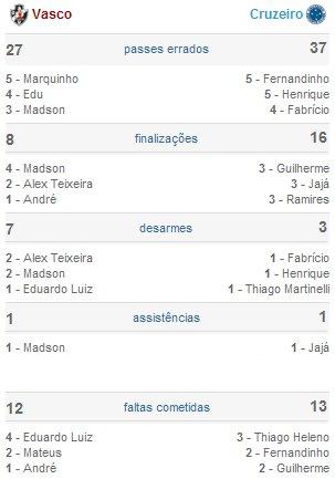GOLS: Guilherme (pênalti), 29'/1ºT (0-1); Ramires, 36'/1ºT (0-2); André (cabeça), 25'/2ºT (1-2); Guilherme (pênalti), 31'/2ºT (1-3) VASCO: Tiago, Wagner Diniz (Marquinhos, 23'/1ºT) , Eduardo Luiz, Jorge Luiz, Edu (André, intervalo); Jonílson, Mateus, Madson, Alex Teixeira (Serginho, intervalo); Edmundo, Alan Kardec. Técnico: Tita CRUZEIRO: Fábio, Jonathan, Thiago Martinelli, Thiago Heleno, Fernandinho; Fabrício, Henrique, Ramires (Camilo, 8'/2ºT)Wagner; Guilherme, Jajá (Gerson Magrão, 22'/2ºT). Técnico: Adilson Baptista. ESTATÍSTICAS