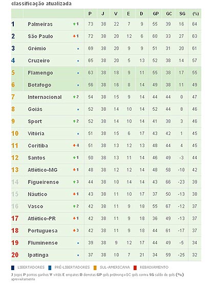 NETVASCO - 04/11/2008 - TER - 17:16 - Simulação baseada no histórico de confrontos livra o Vasco da degolaNão há mais tempo para ajustes ou erros no Campeonato Brasileiro. As calculadoras funcionam em um ritmo frenético e cada ponto vale ouro nessa reta final. Restam apenas cinco rodadas para que o campeão seja conhecido, as vagas para a Libertadores e Sul-Americana sejam definidas e quatro times encarem a dolorosa notícia de que disputarão a Série B em 2009. Para facilitar a vida do torcedor e dos clubes, o GLOBOESPORTE.COM propôs uma forma de "prever" os resultados destes confrontos finais. Tendo como base os resultados históricos de cada duelo em particular, utilizamos o simulador da competição para chegar a uma possível "tabela final". Segundo esses critérios, o Palmeiras seria o campeão, São Paulo, Grêmio e Cruzeiro fechariam sua participação no G-4 e o Flamengo teria de se contentar com a quinta posição. Na parte de baixo, o Fluminense estaria na lista de rebaixados e o Vasco se livraria por muito pouco.
