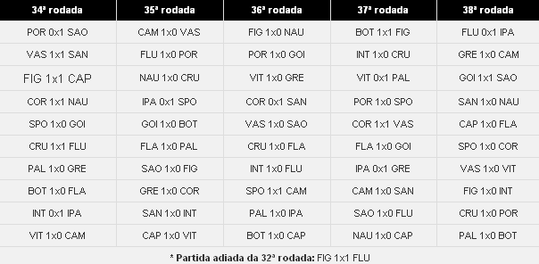 O resultado de 1 a 0 foi escolhido como padrão para jogos em que há um vencedor e o placar de 1 a 1, para os jogos em que há empate. Um exemplo desse último caso é a partida entre Cruzeiro e Fluminense, que será disputada na 34ª rodada, no Mineirão. No histórico do confronto, em jogos em que o mando de campo é dos mineiros, o número de vitórias é o mesmo para os dois times: 5. Como não há um time com retrospecto melhor do que o outro, o placar adotado foi o padrão para empates: 1 a 1.