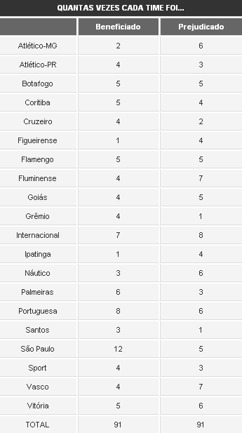 No campeonato inteiro, o clube mais prejudicado até agora foi o Fluminense, que ganharia oito pontos. A equipe sofreu com a arbitragem nas partidas contra Sport (Recife), Santos (Rio), Coritiba (Rio) e Vitória (Salvador). Em todas elas, passaria a somar pontinhos preciosos, pulando para a 11ª colocação.