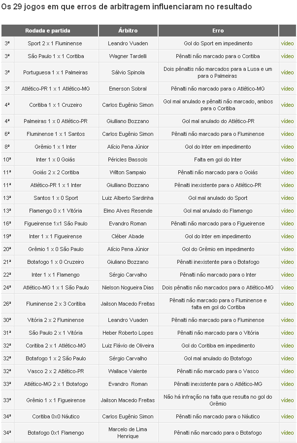 Foi uma tarefa árdua. A reportagem do GLOBOESPORTE.COM analisou todas as partidas do Brasileirão em busca de erros decisivos - aqueles que fizeram diferença no placar. De 340 confrontos, 29 mudaram de resultado e alteraram a tabela de classificação. Esse número representa 9% do total.