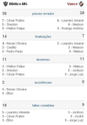 A torcida atleticana lotou o Mineirão e cantou desde o começo embalando os gols do Galo com os gritos de ‘Vou festejar, o seu sofrer, o seu penar’. Um a um eles foram saindo e depois do quarto, marcado por Leandro Almeida, de pênalti, os torcedores passaram a pedir pelo sexto. O Vasco esboçou uma reação aos 23 minutos, com um gol de Madson, mas a derrota já estava sacramentada.