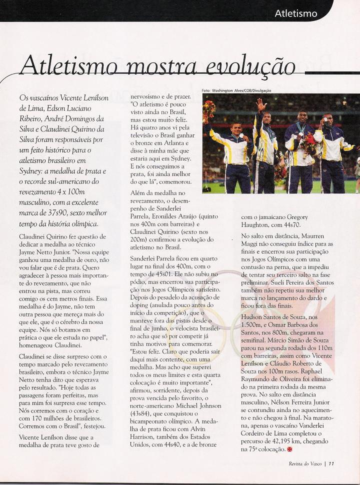 Página 11 da Revista oficial do Vasco (Ediouro), edição nº 10, de setembro de 2000, registrando a medalha de prata do revezamento brasileiro 100% vascaíno em Sydney-2000